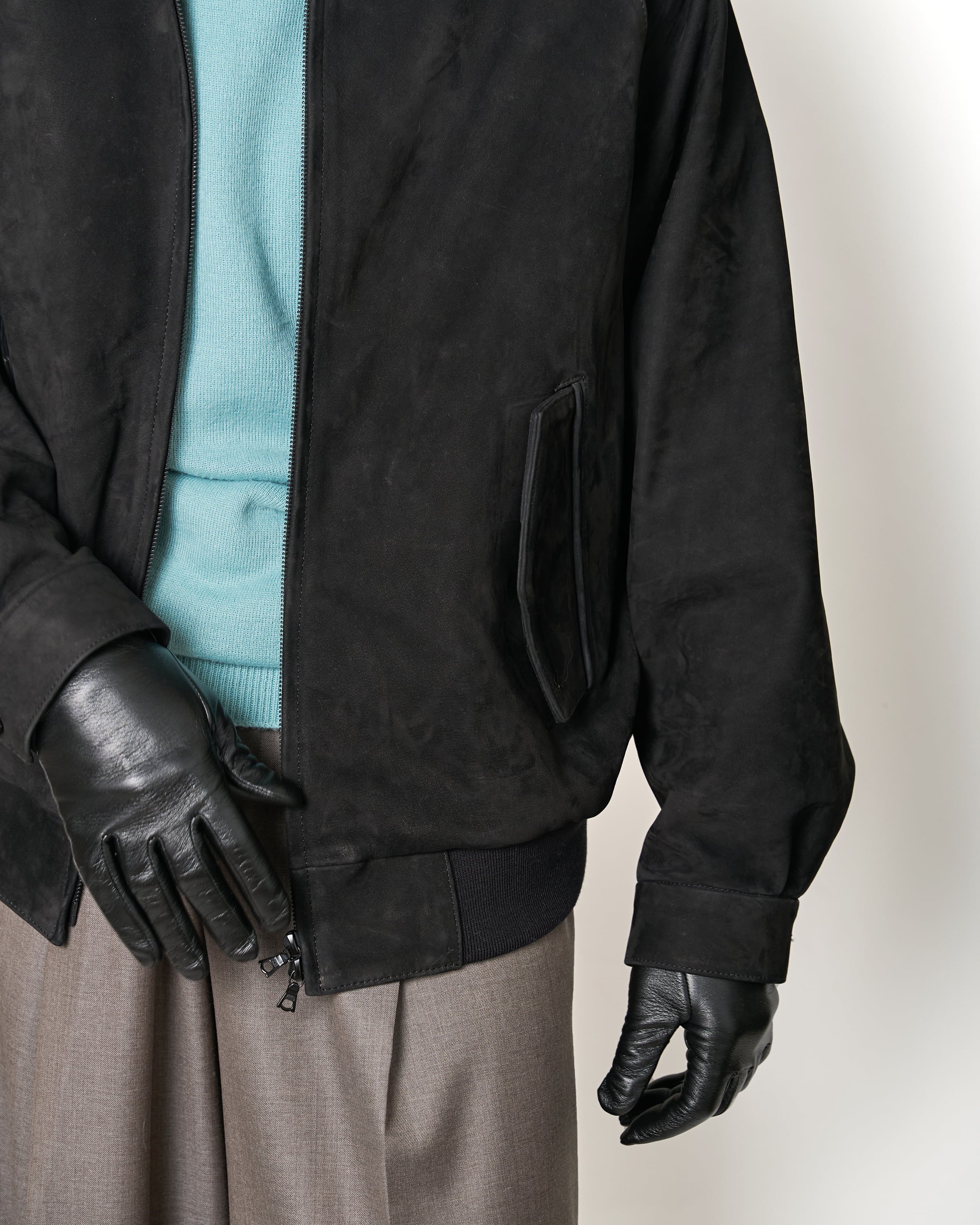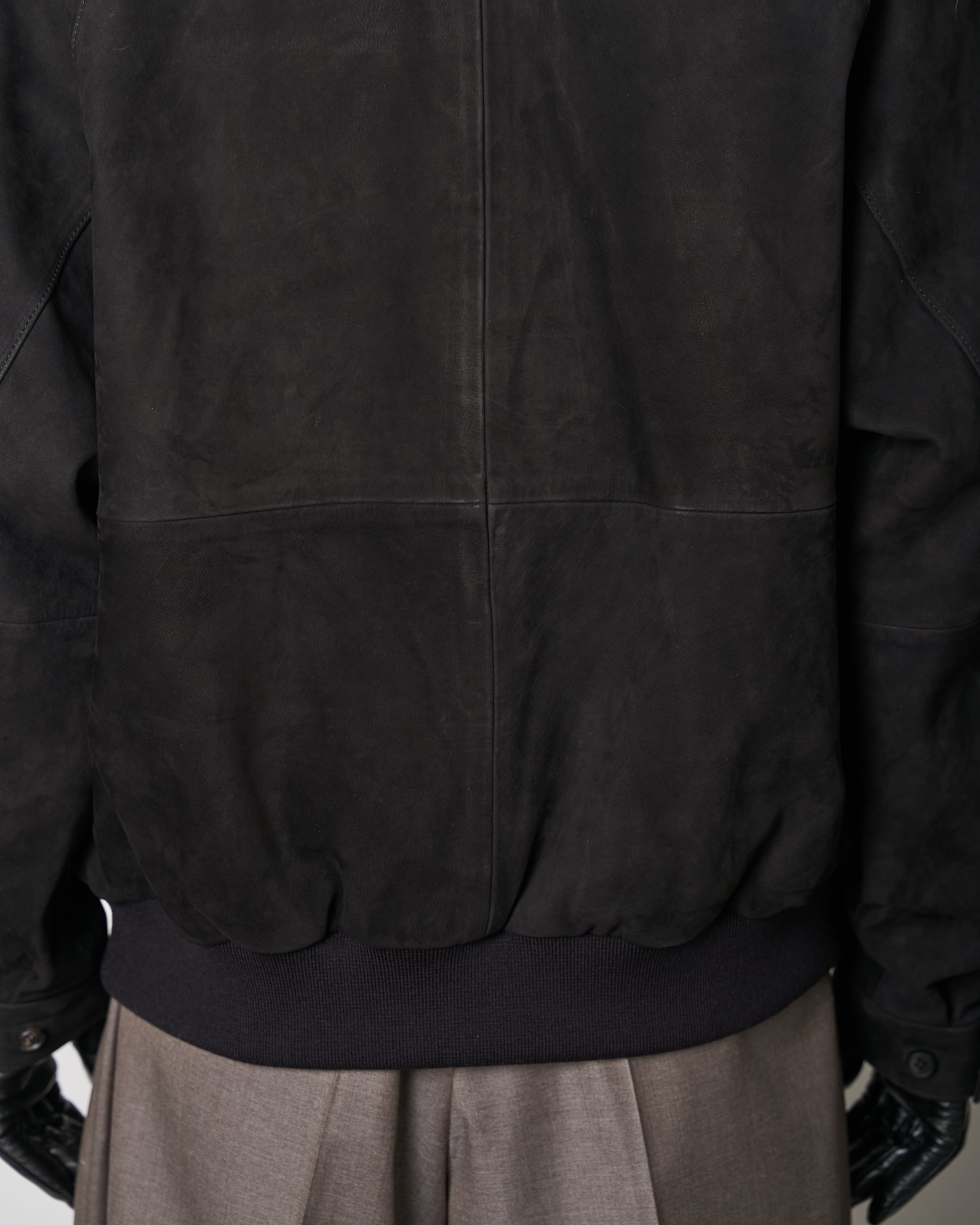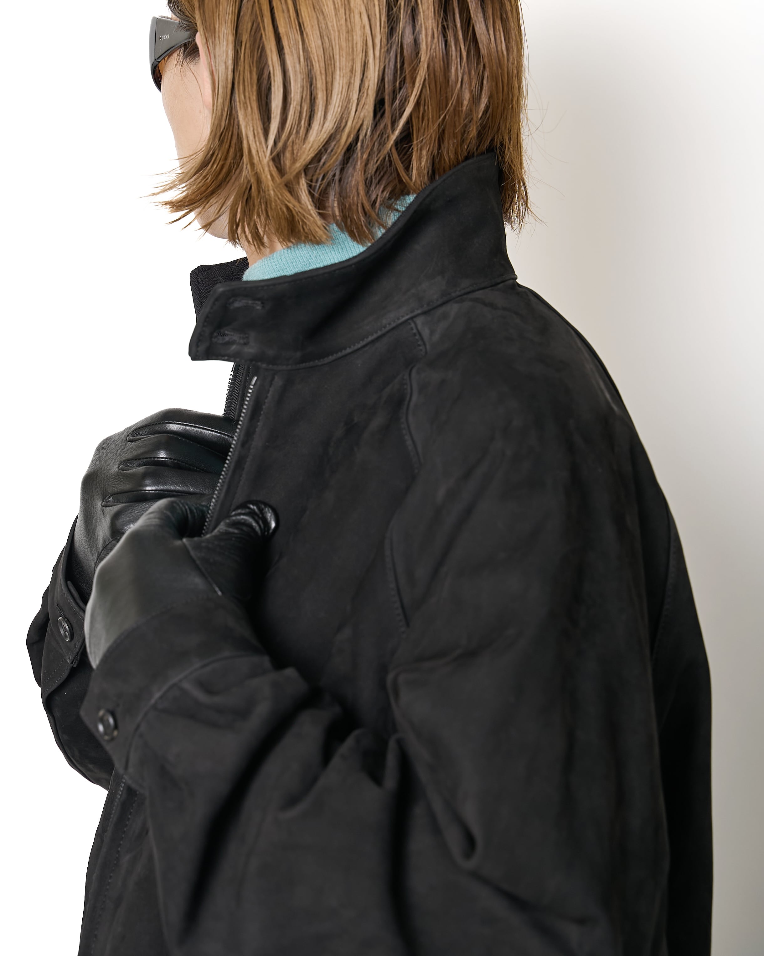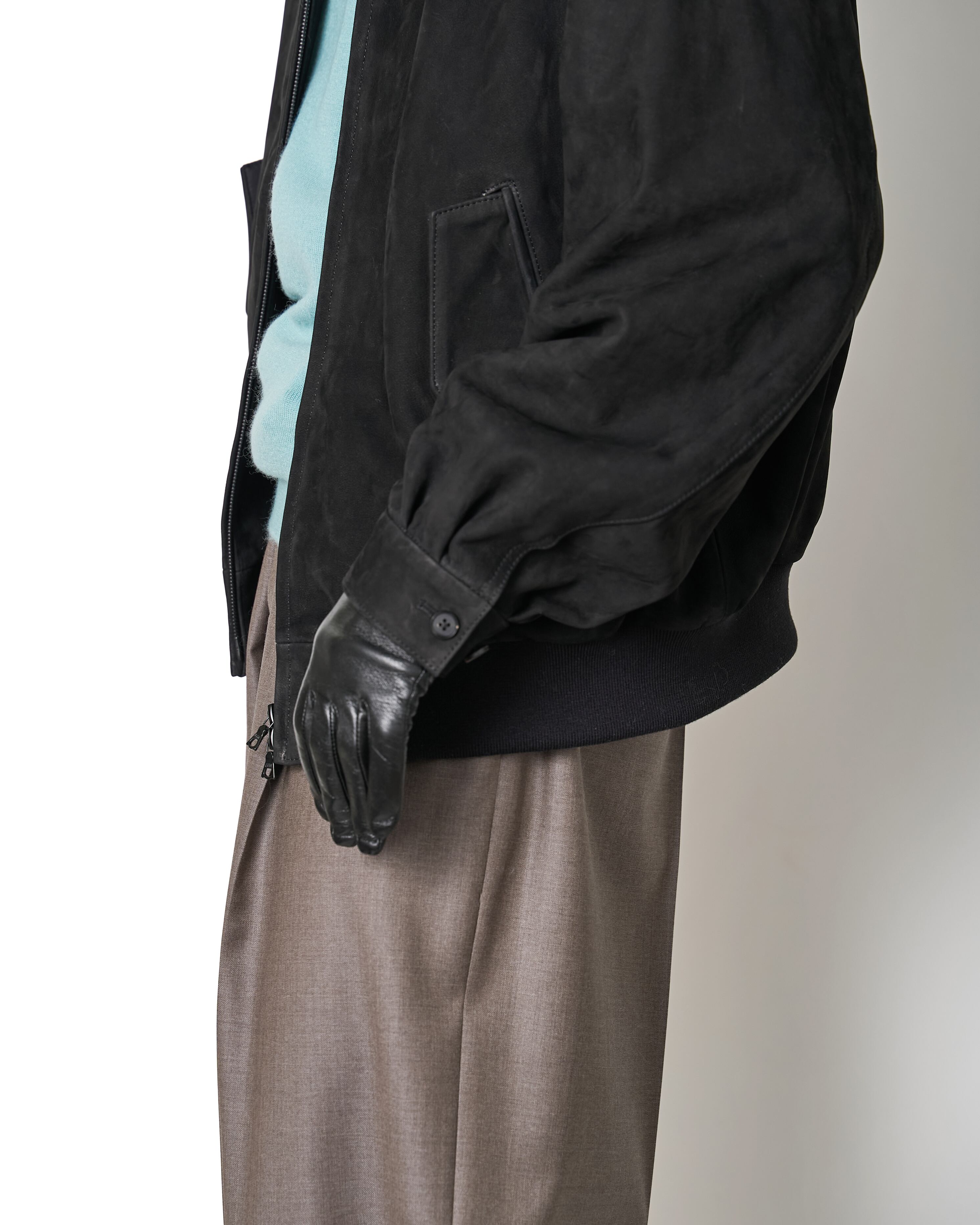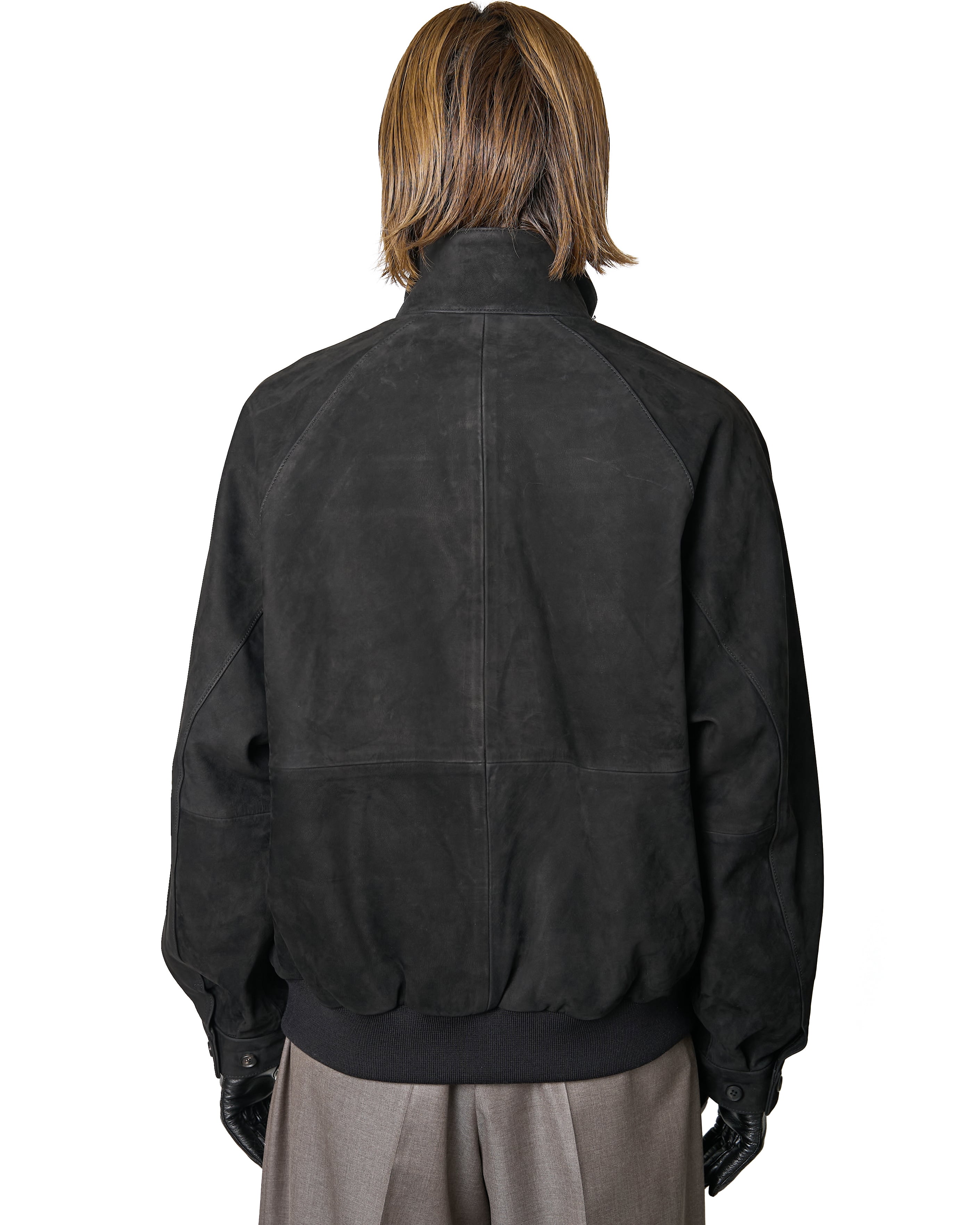 カウヌバックを使用した、コンパクトなフォルムのスウィングトップジャケット。スムースなヌバックの無機質な空気感が、シンプルなデザインを引き立てています。