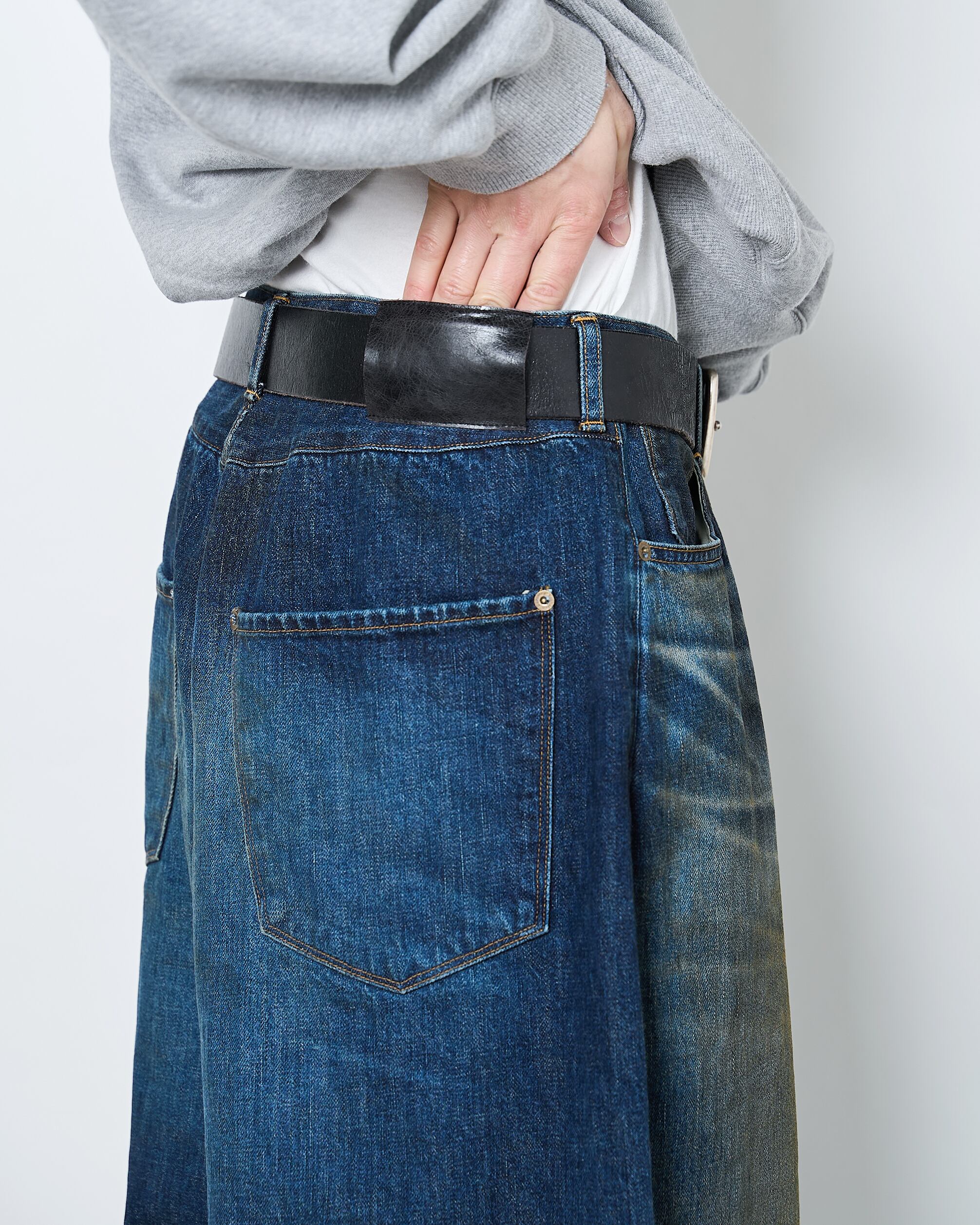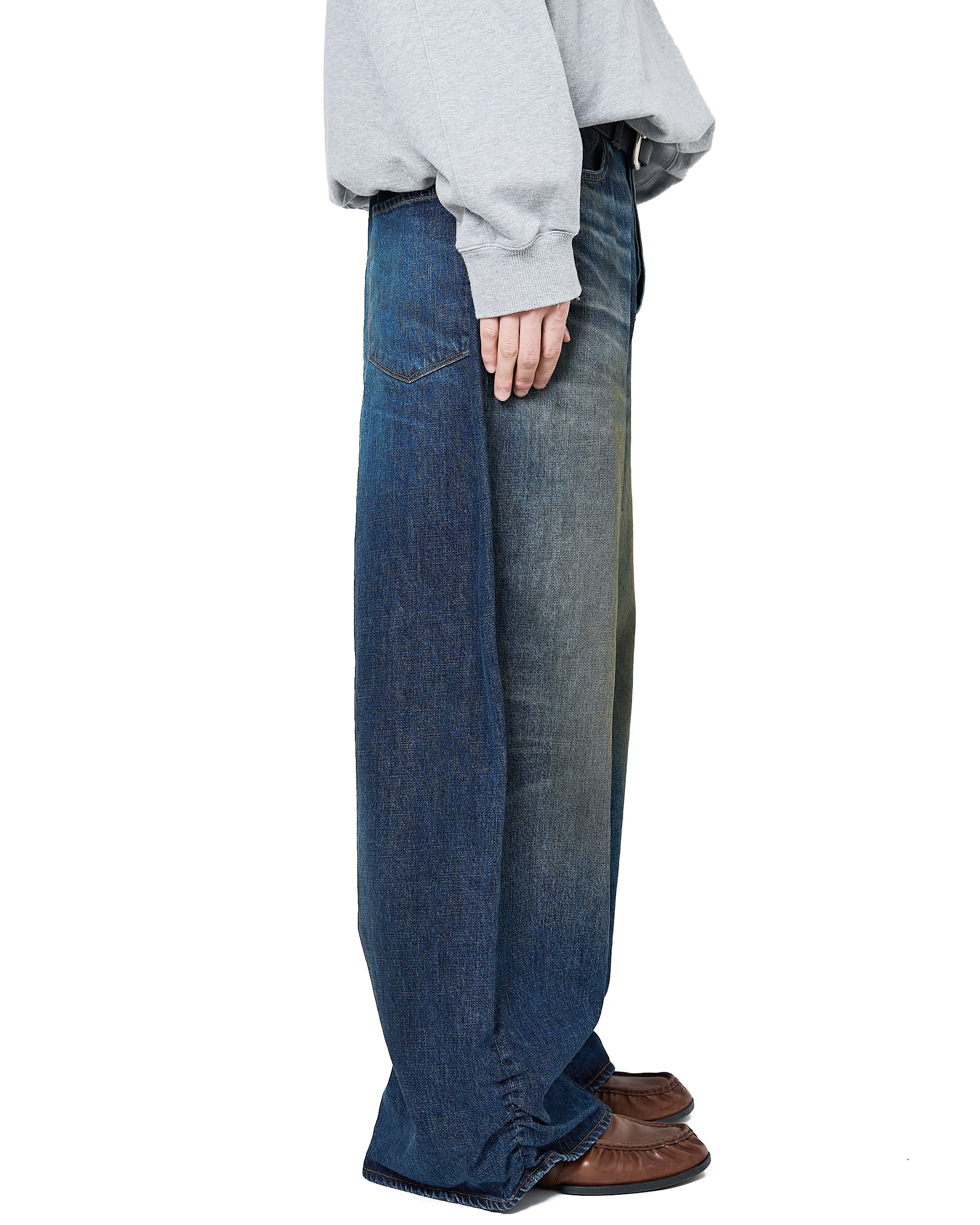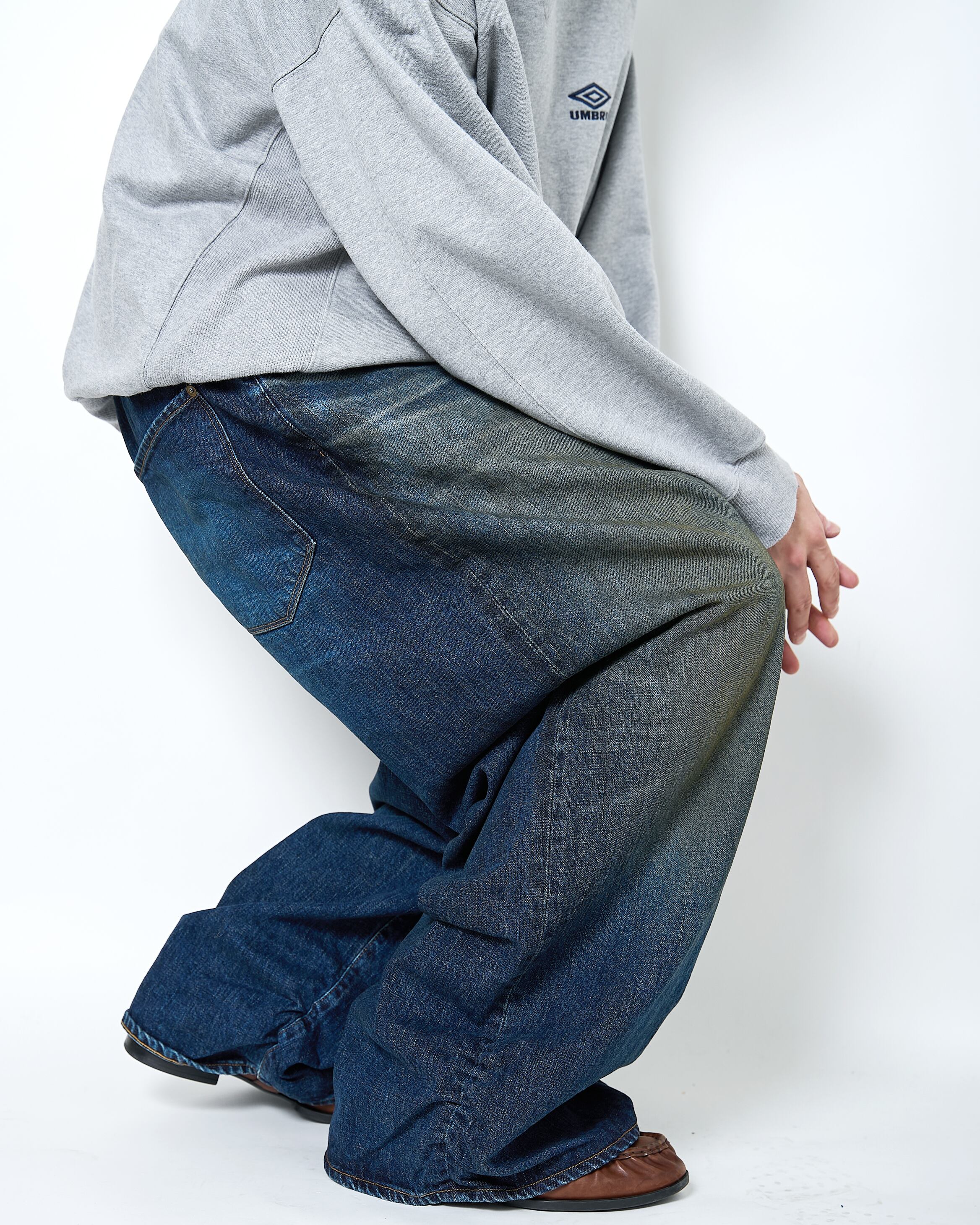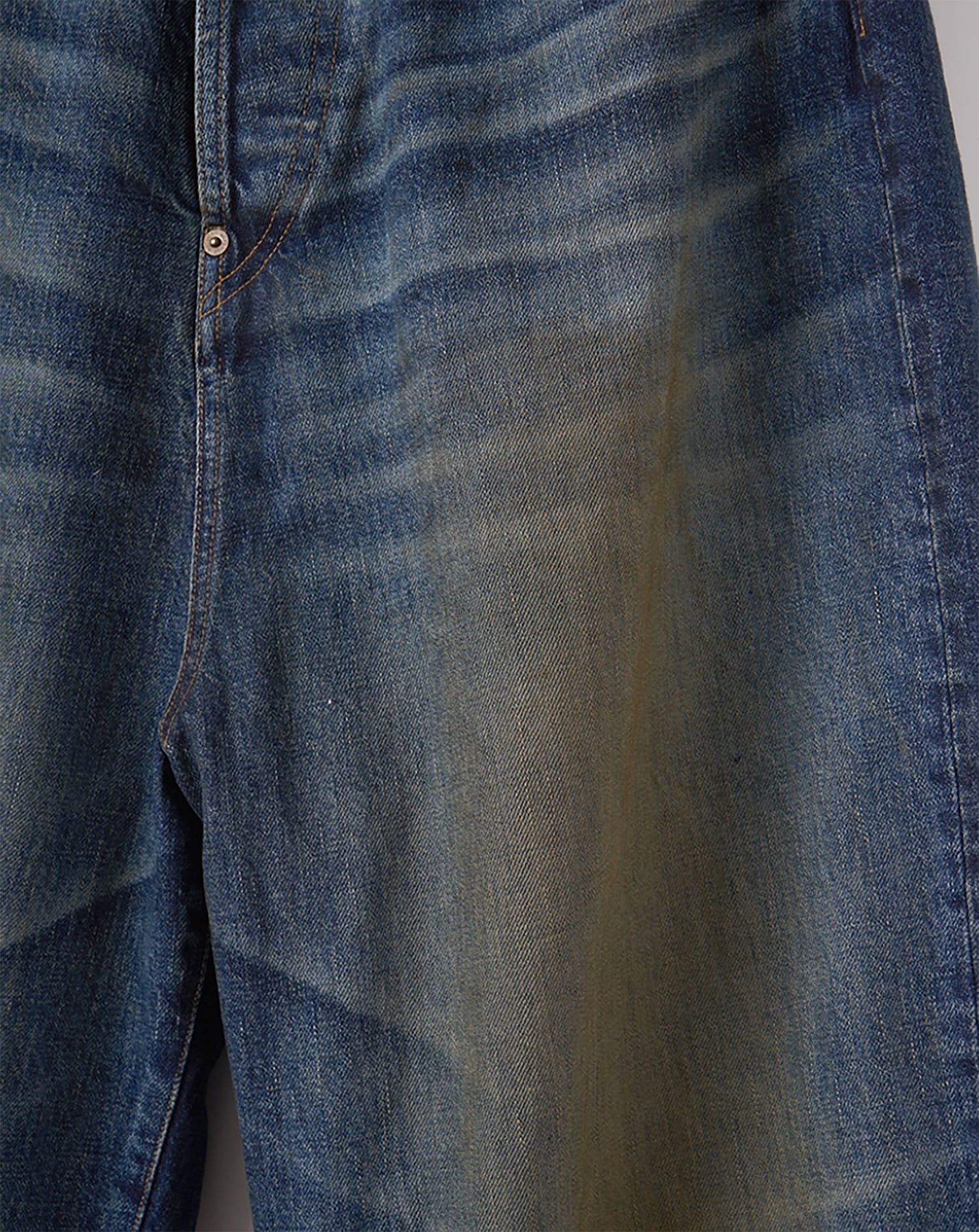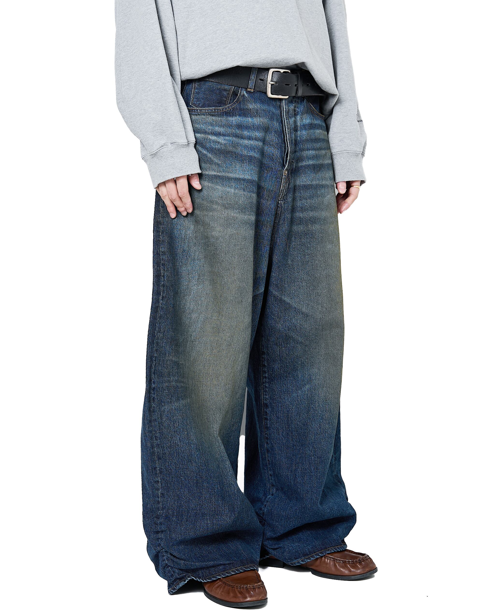 超超ワイドや、5超など職人たちの中ではパンツの太さでキャラクター性を表現していたことから着想を得て、シルエット調整をしたデニムパンツ。生地は13.5ozのムラ糸デニムを使用し、錆汚れをイメージした加工を強く施したユーズド仕上げ。バックヨークのギャザーや裾のクッションになるデザイン、ヴィンテージデニムのディテールが特徴的です。