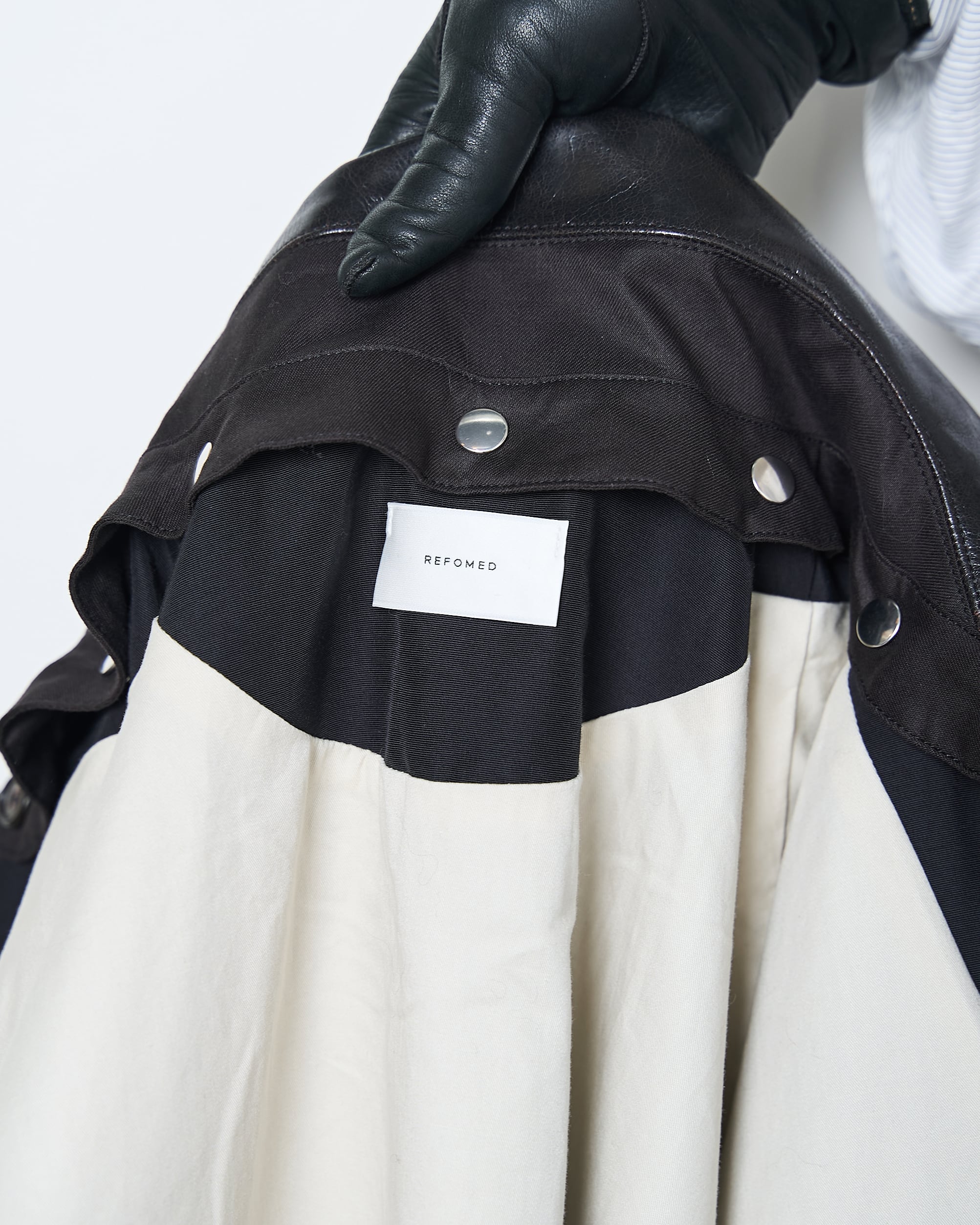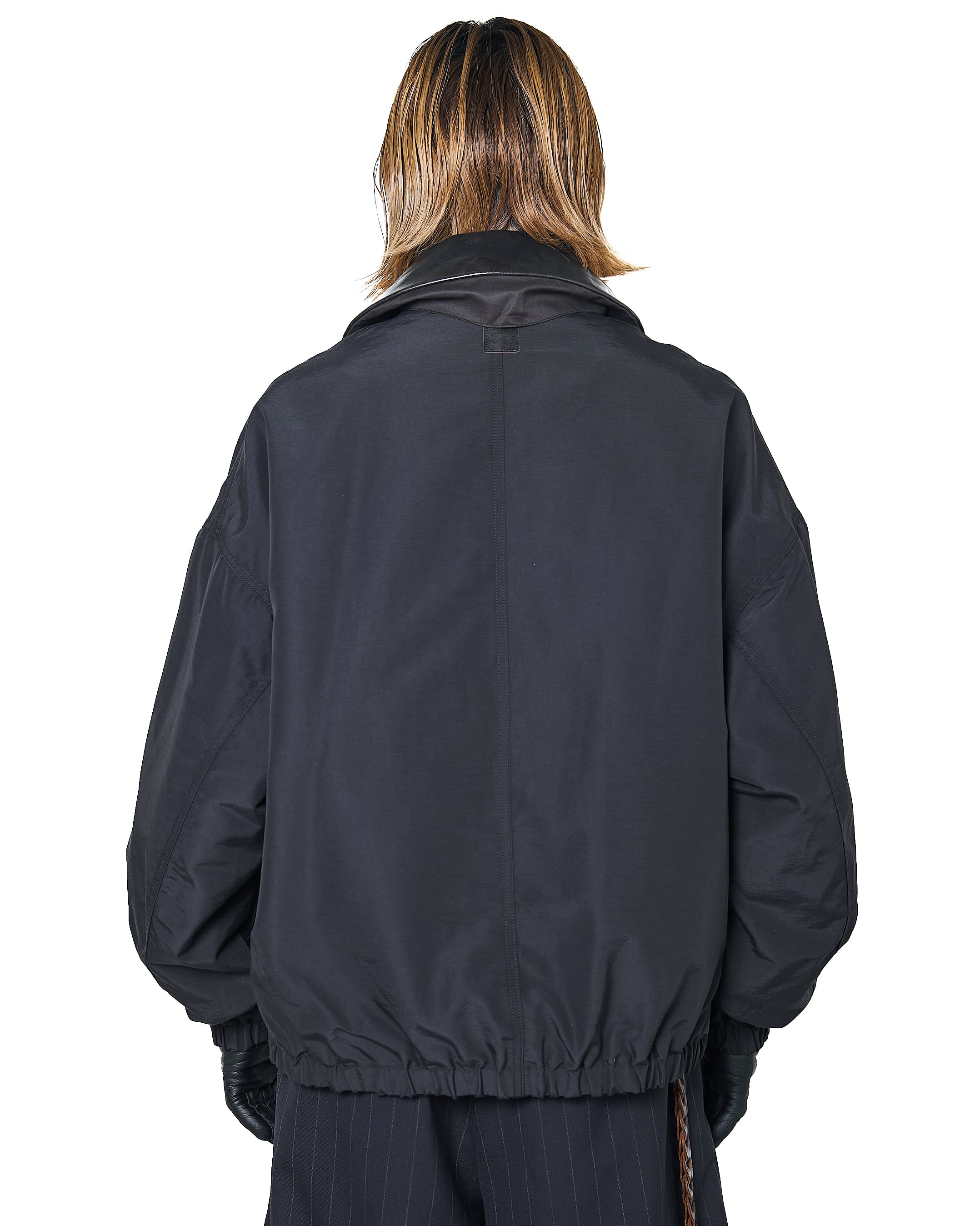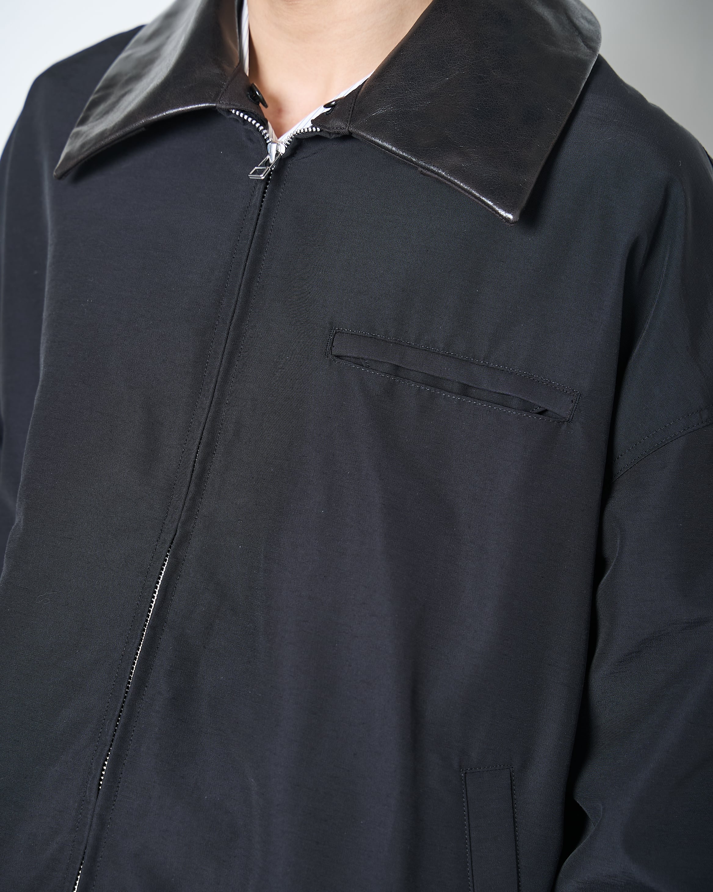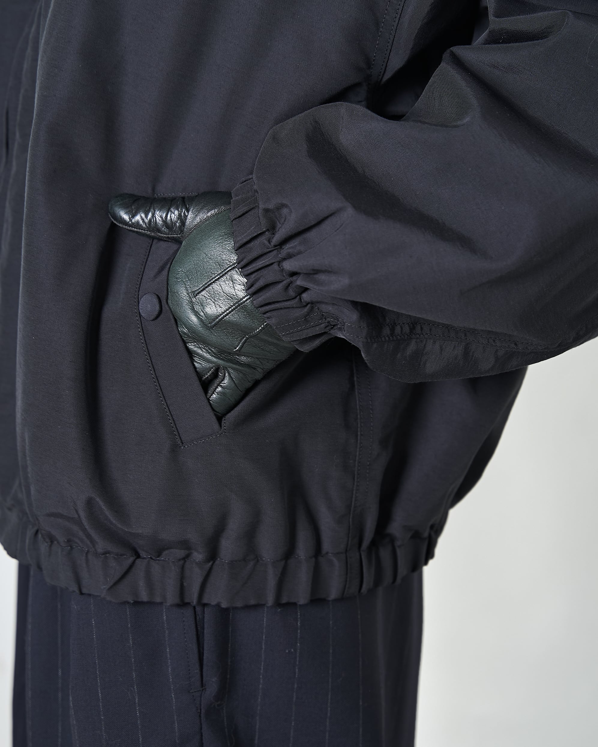 袖口、裾にかなりテンションをかけたゴムを使用しており、ショート丈で丸みのあるシルエットが特徴なジャケット。素材は撥水性のある64クロスグログランを使用し、襟には茶芯顔料染めホースレザーを使用。土臭いアイテムになりがちな歴史のあるデザインですが、品よく仕上がっています。