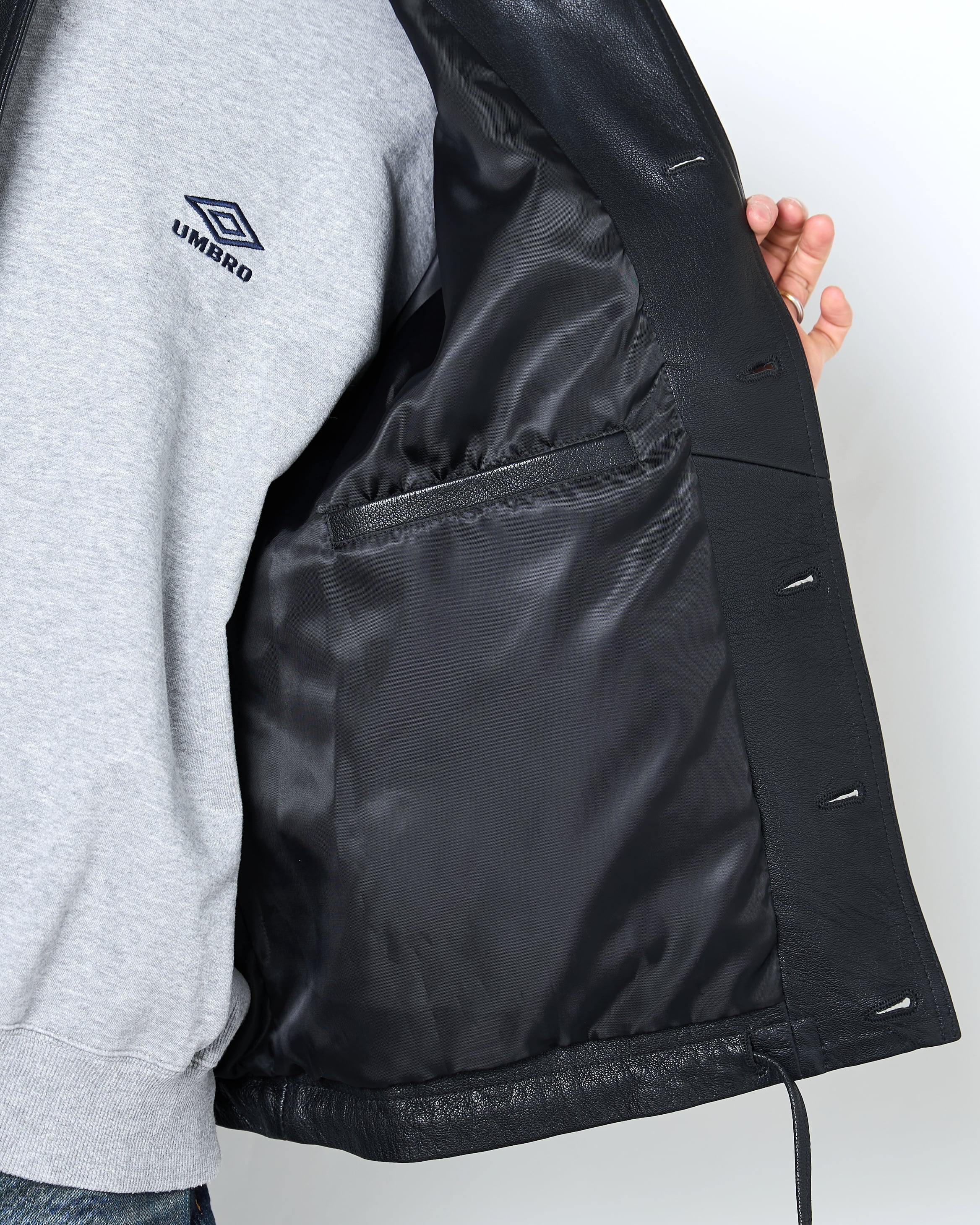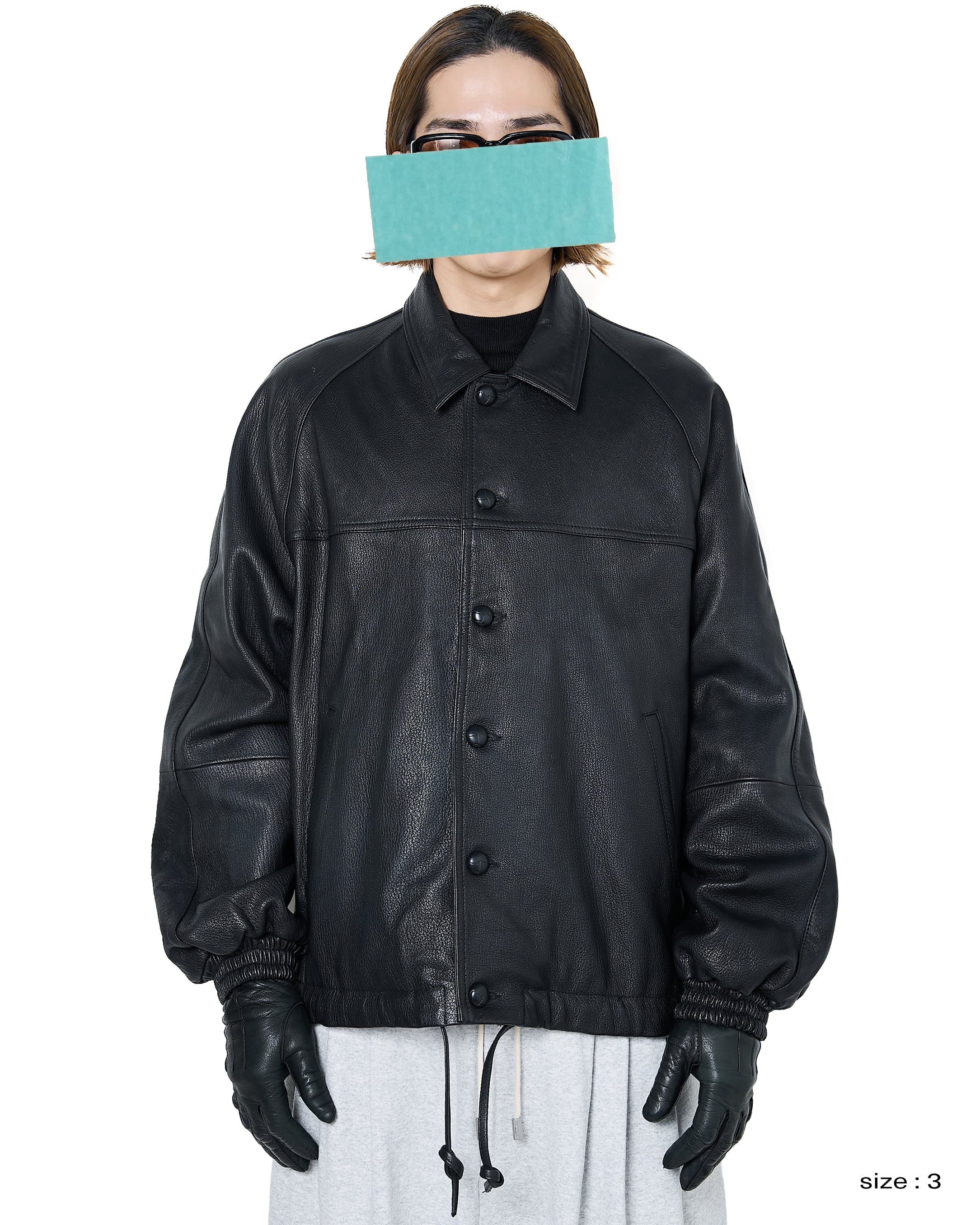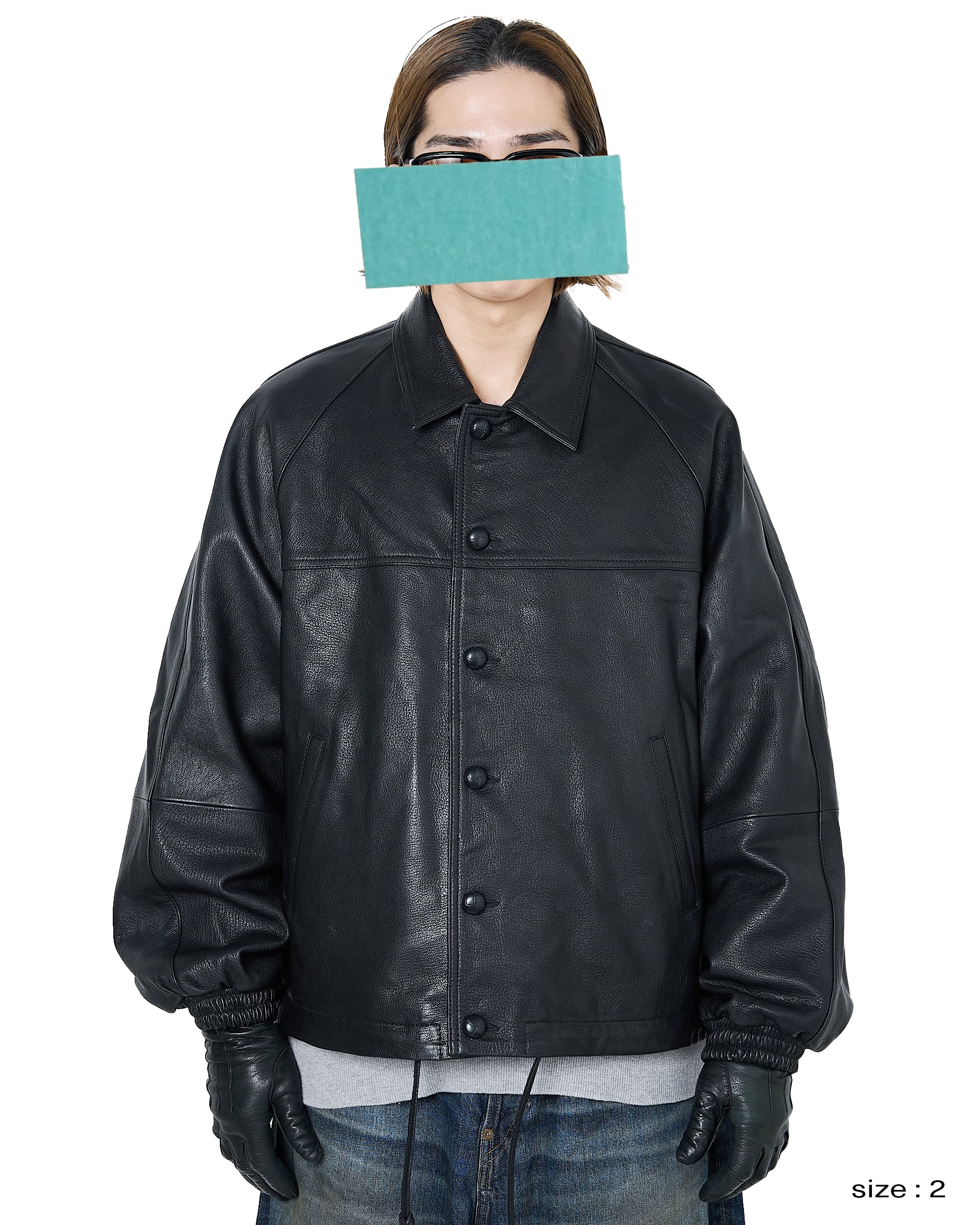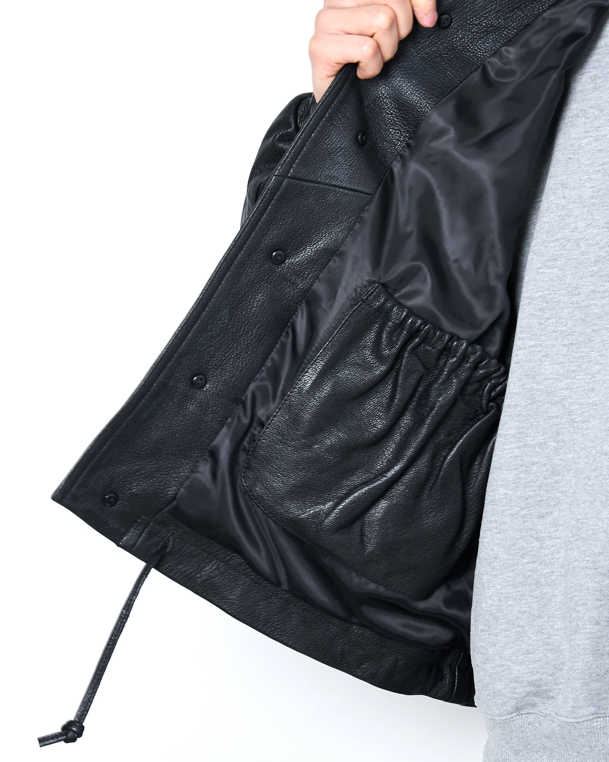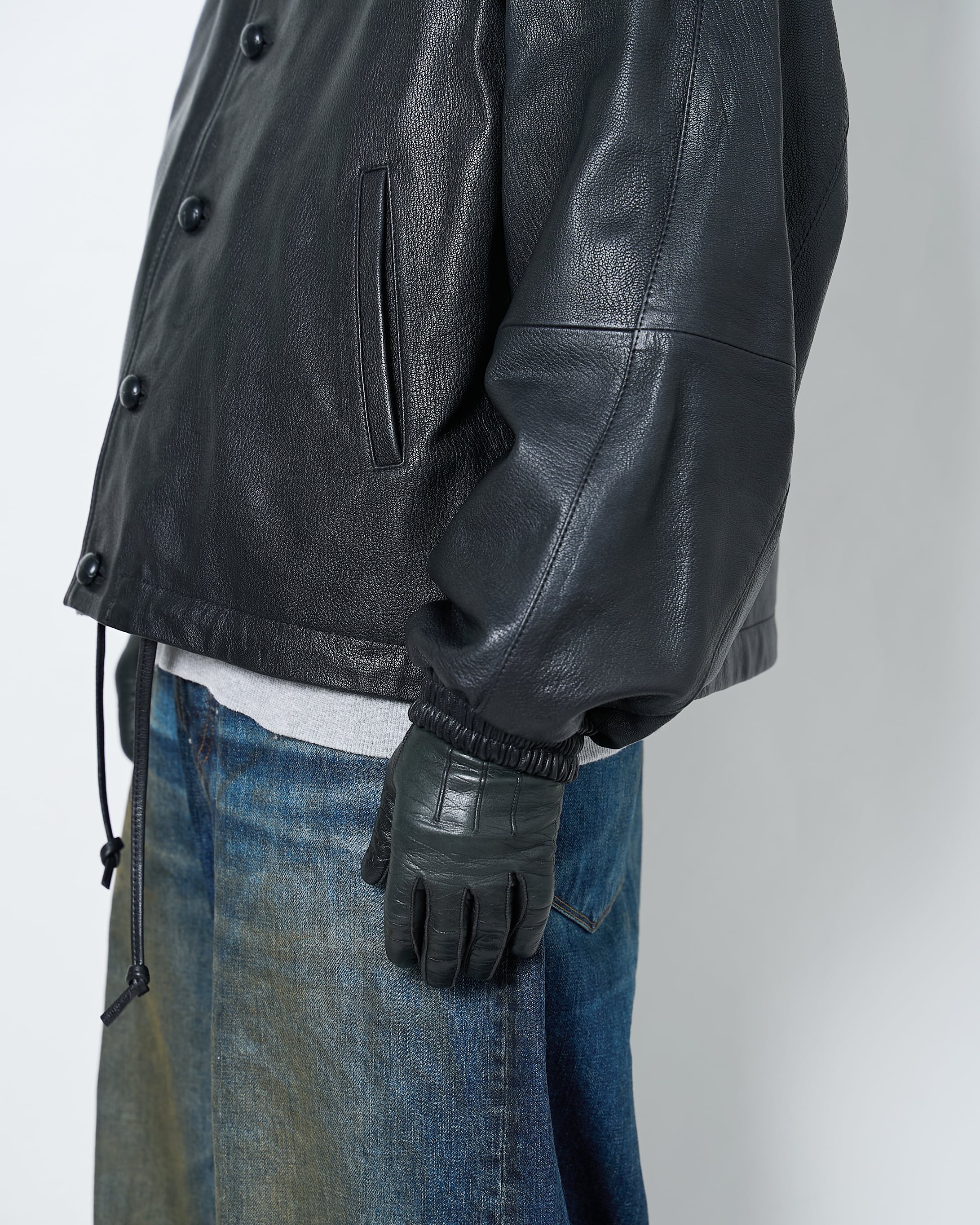 裾には共地となるレザーのドローコードが施され、レザーの包みボタンを採用。堅牢な雰囲気のレザージャケットながらも、コーチジャケットのようなラフな雰囲気も漂います。