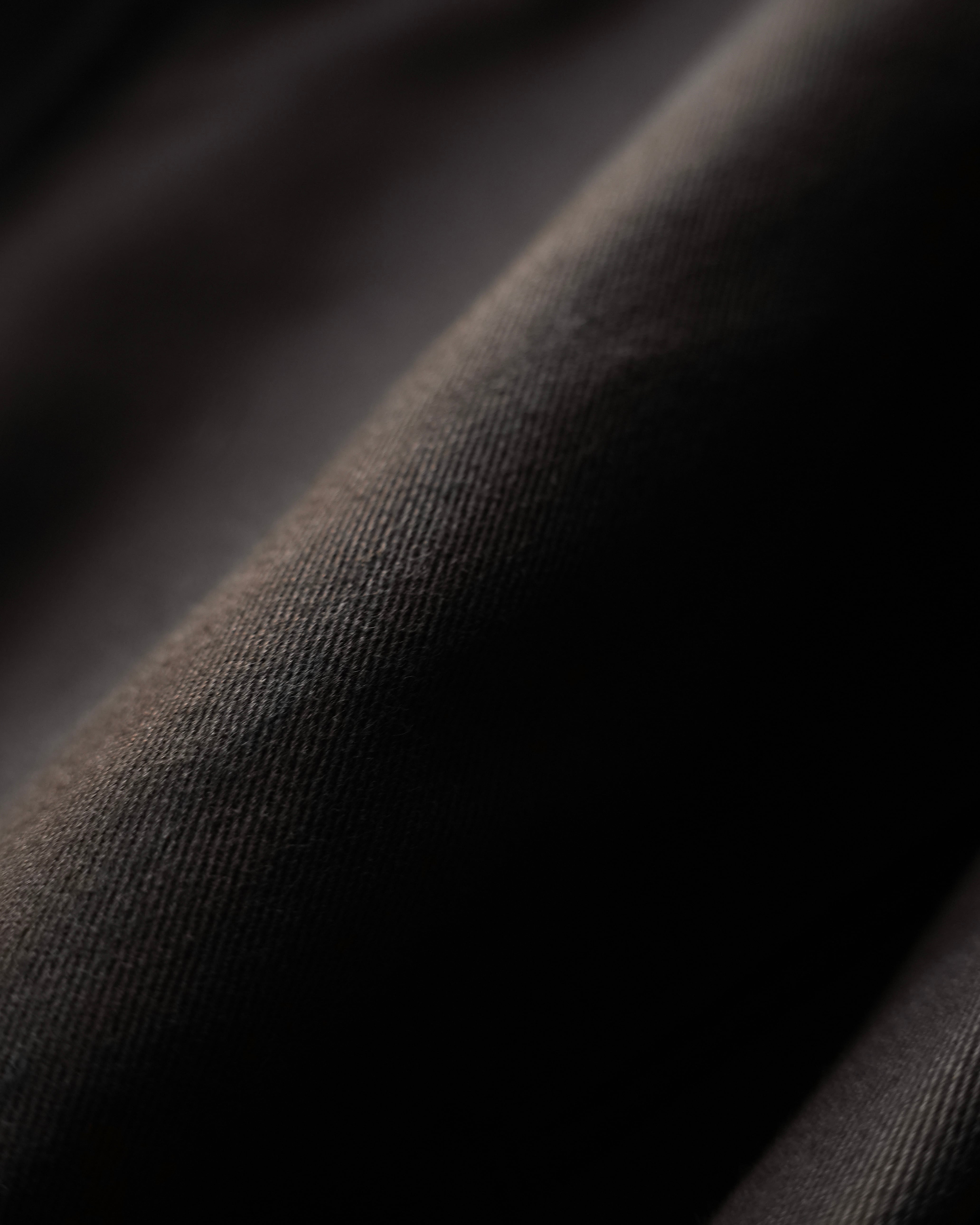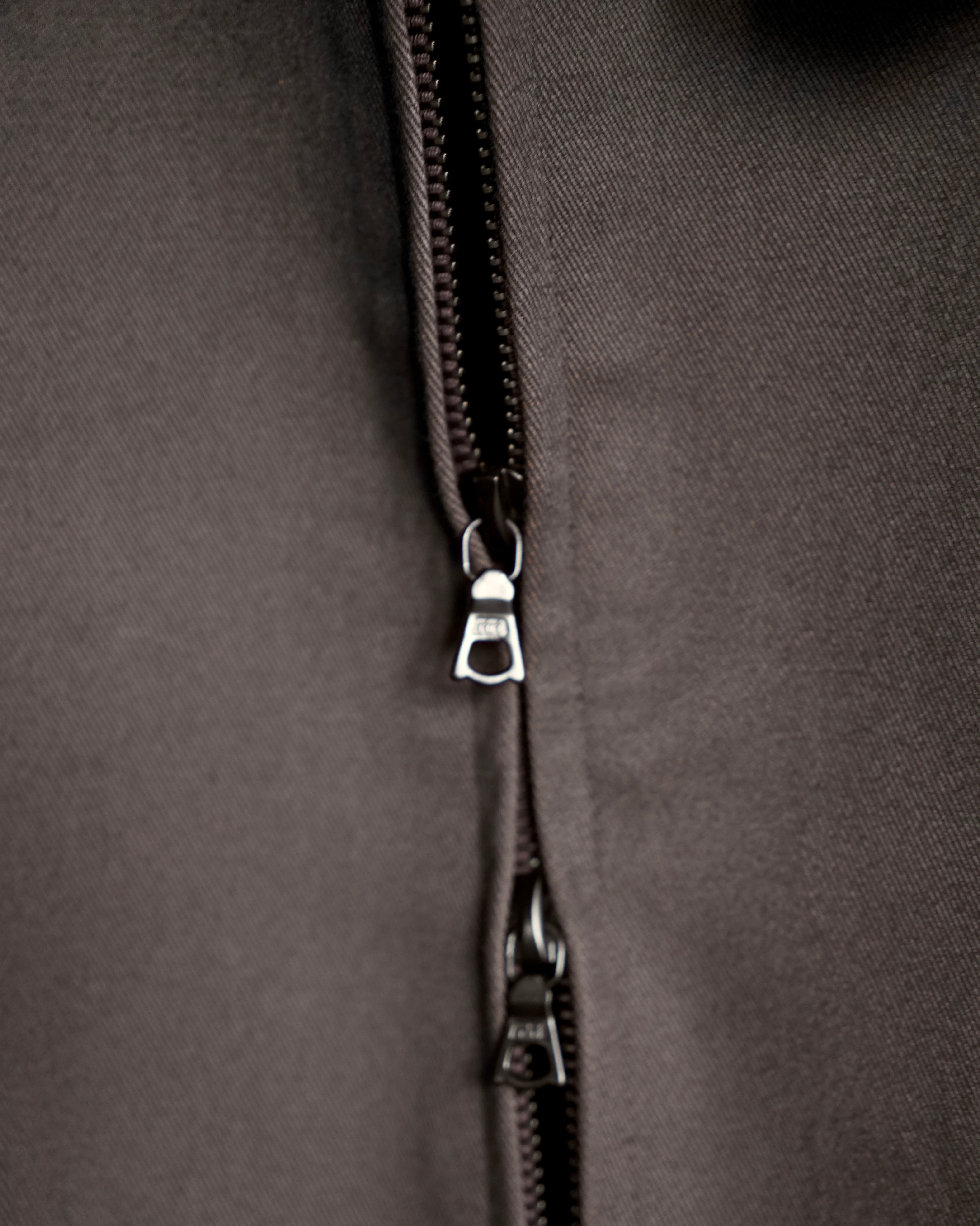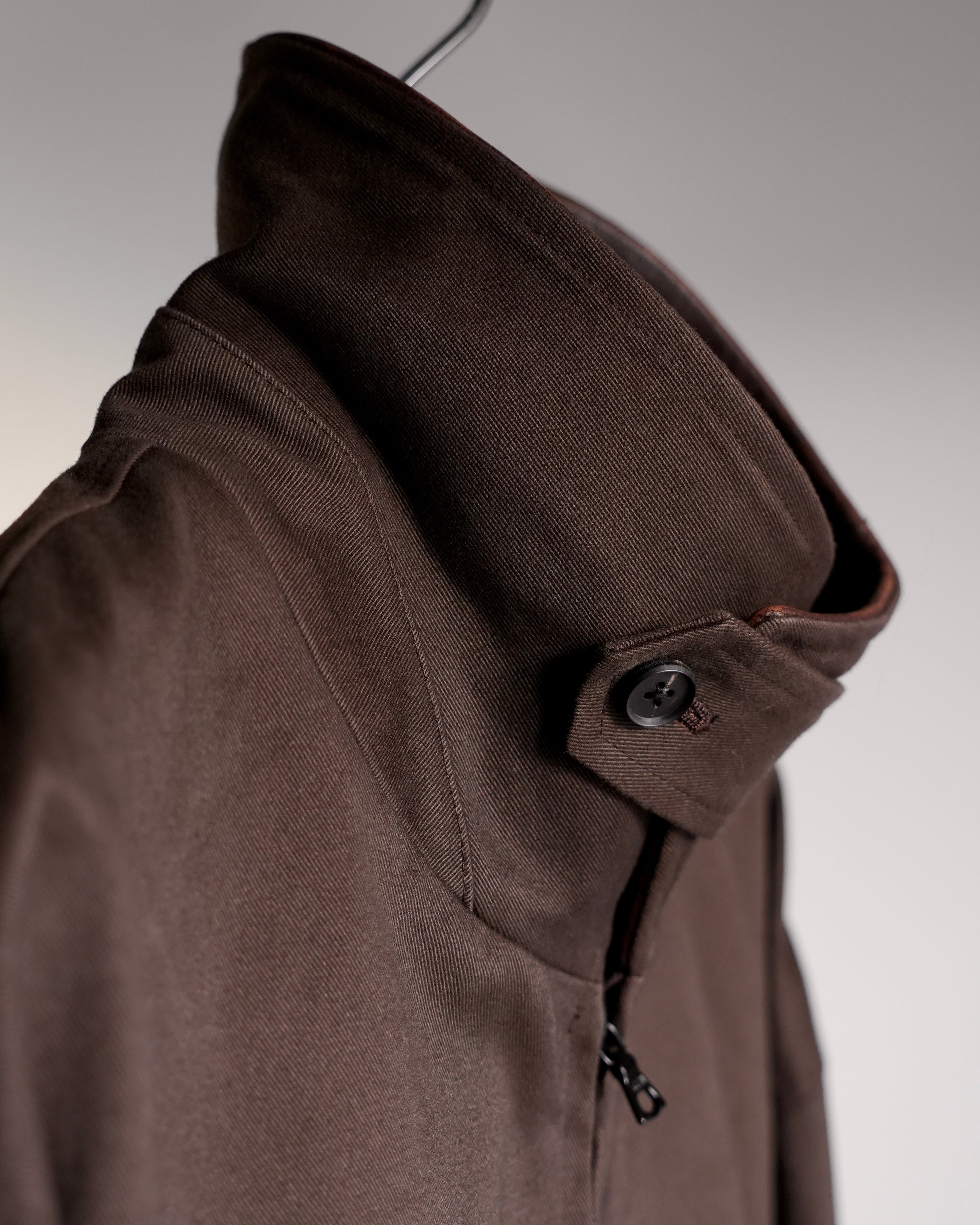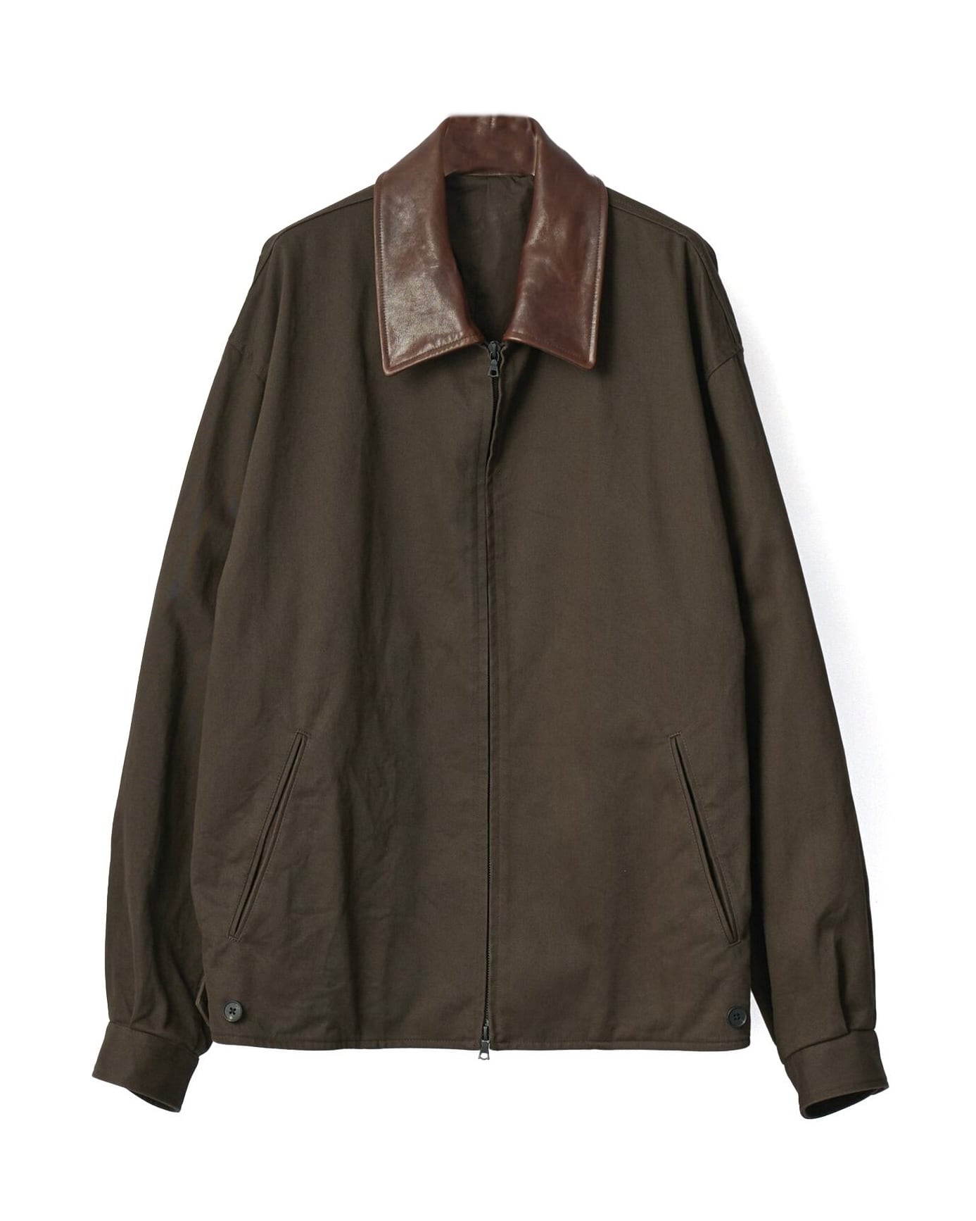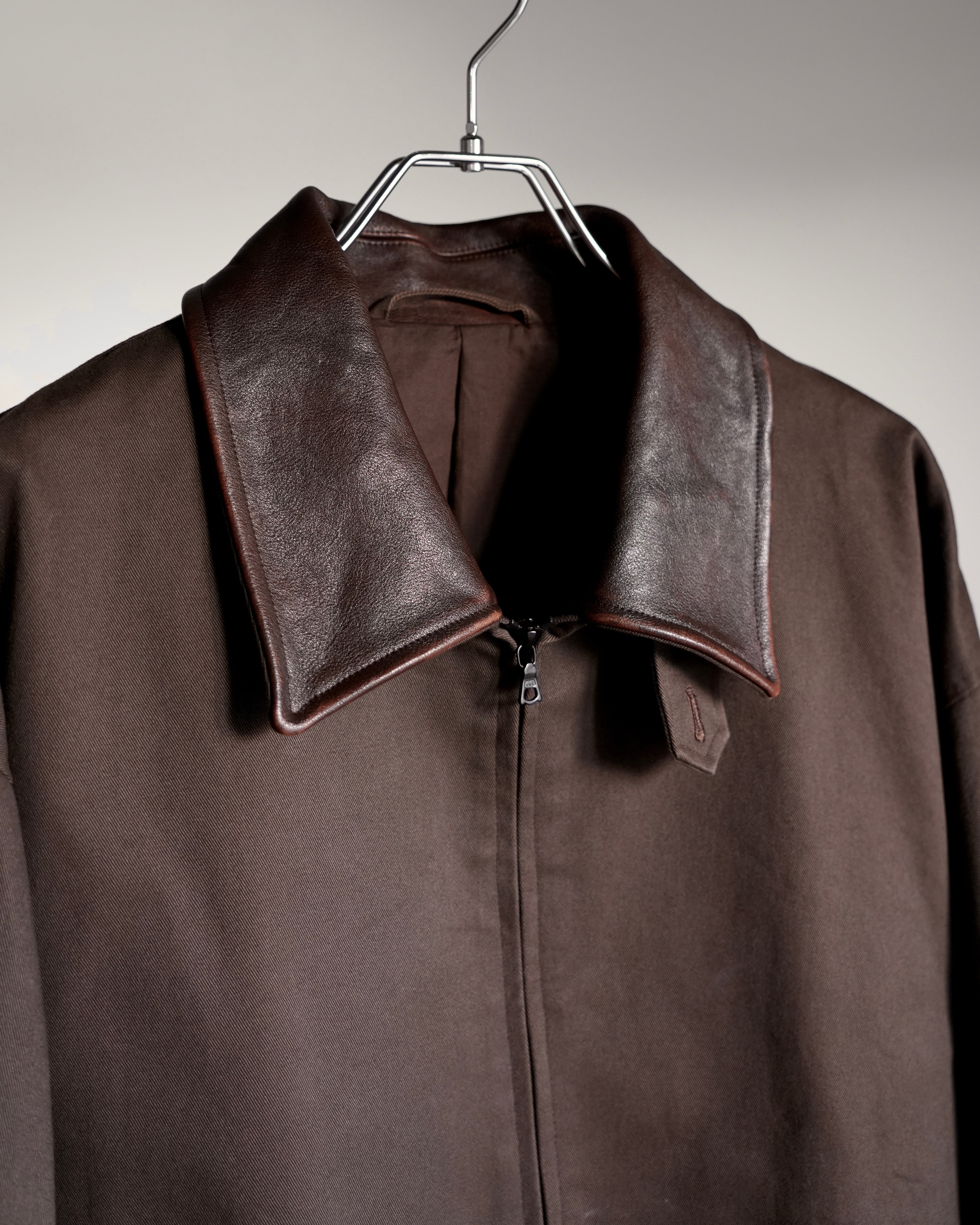 16×10の肉厚チノを微起毛で仕上げた素材を使用したジップジャケット。ミニマルな印象に仕上げ、襟のカウレザー、裾の長めに設定したタブが少しのニュアンスになっています。硫化+微起毛により、洗い込むごとにスエードのような風合いになっていくので、エイジングを楽しみながらご着用ください。