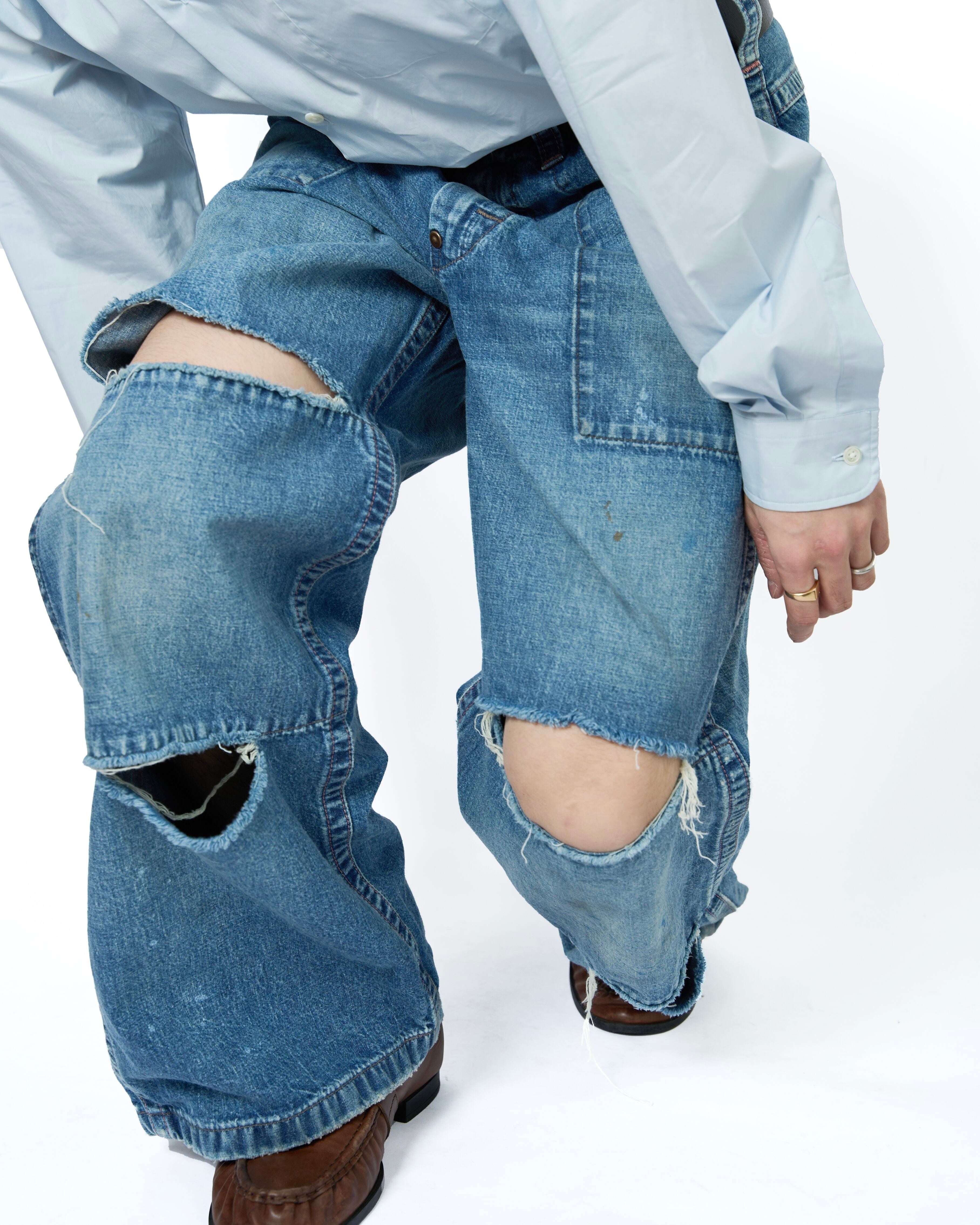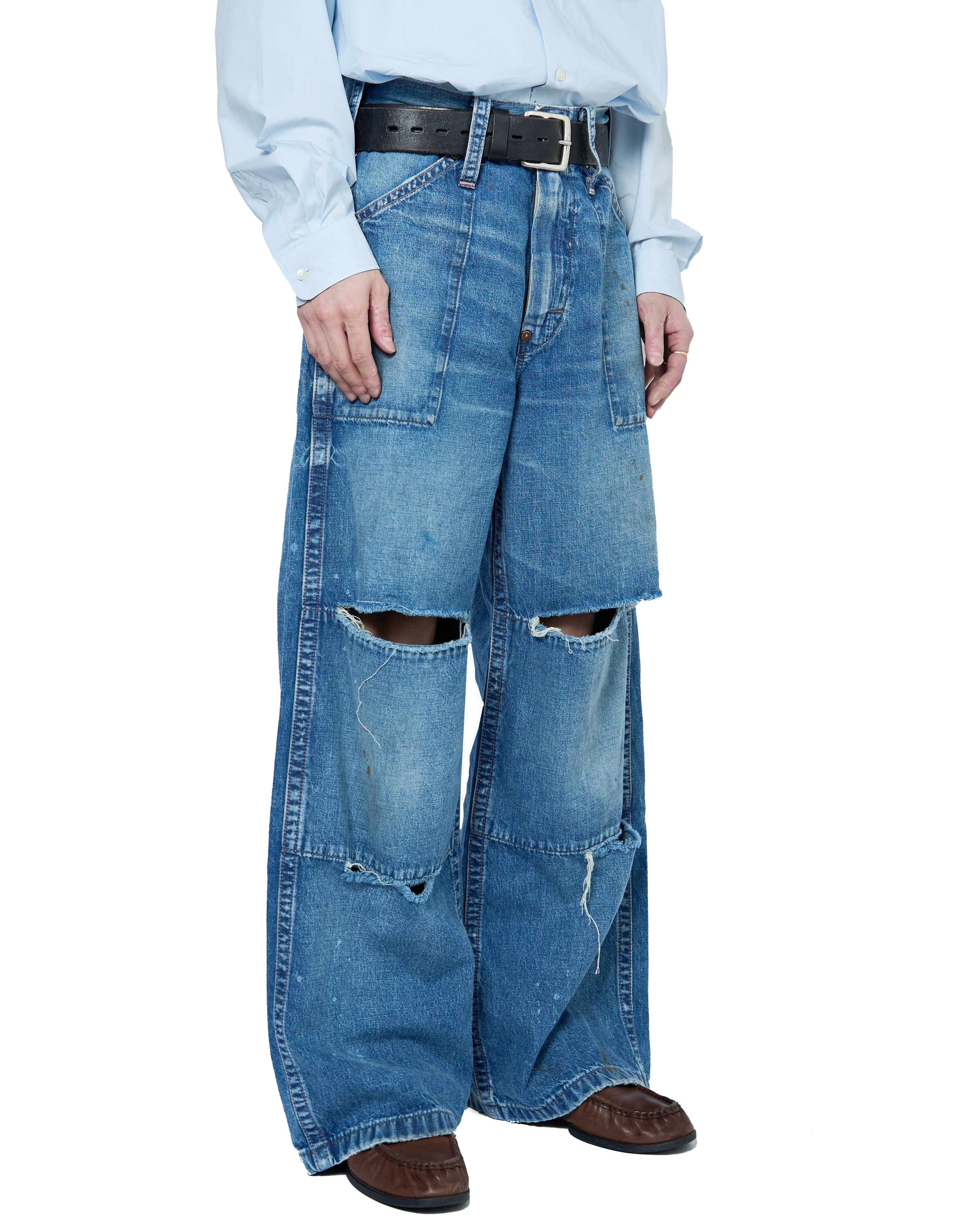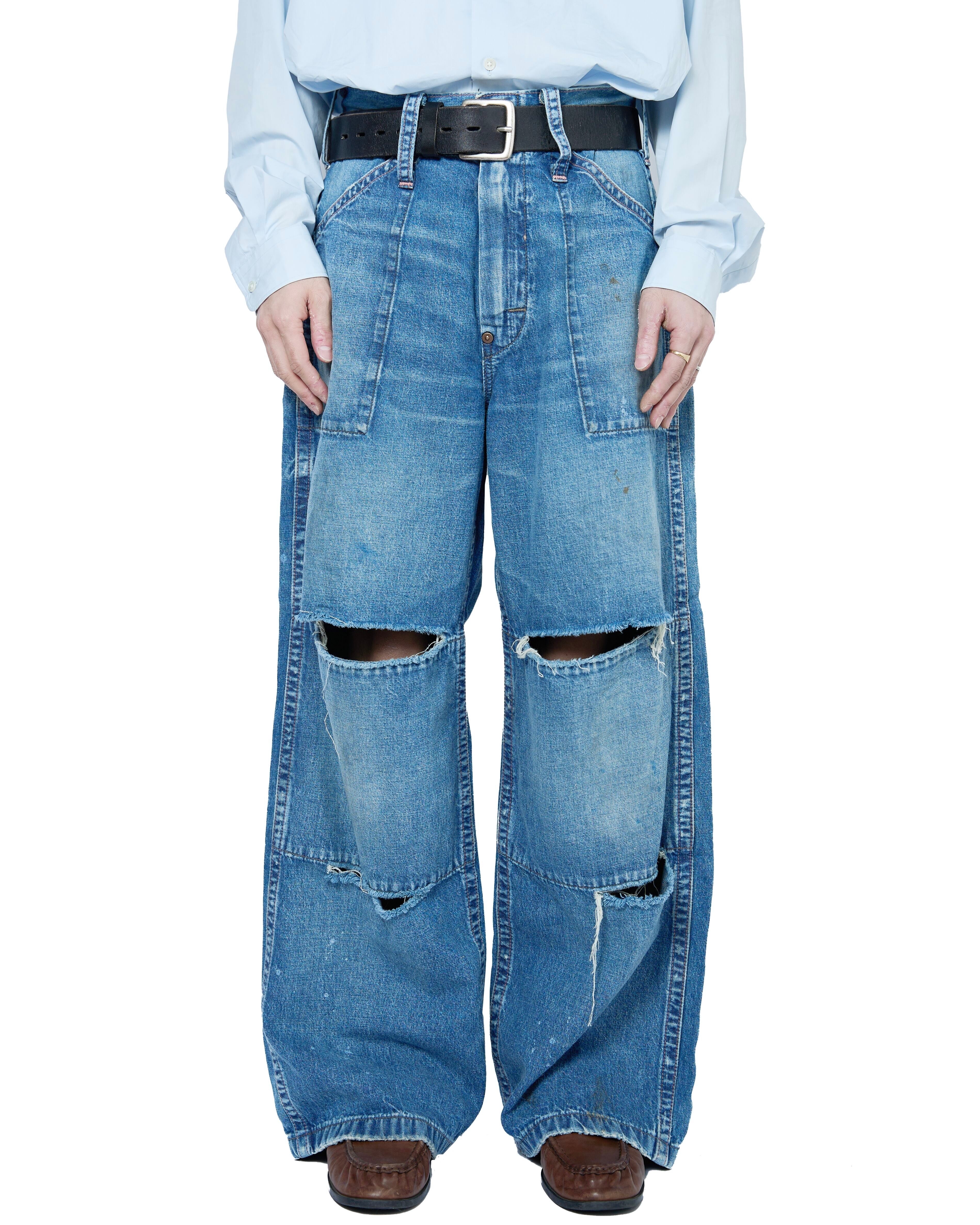 極端に太い足回りが特徴的で、堅牢な仕様であるダブルニー仕様。しかし、基のデザイン同様、に"酷使されながらも長年にわたって愛用されたサマ"を再現し、ダブルニー部分の両端が激しく破れているデザインになっています。