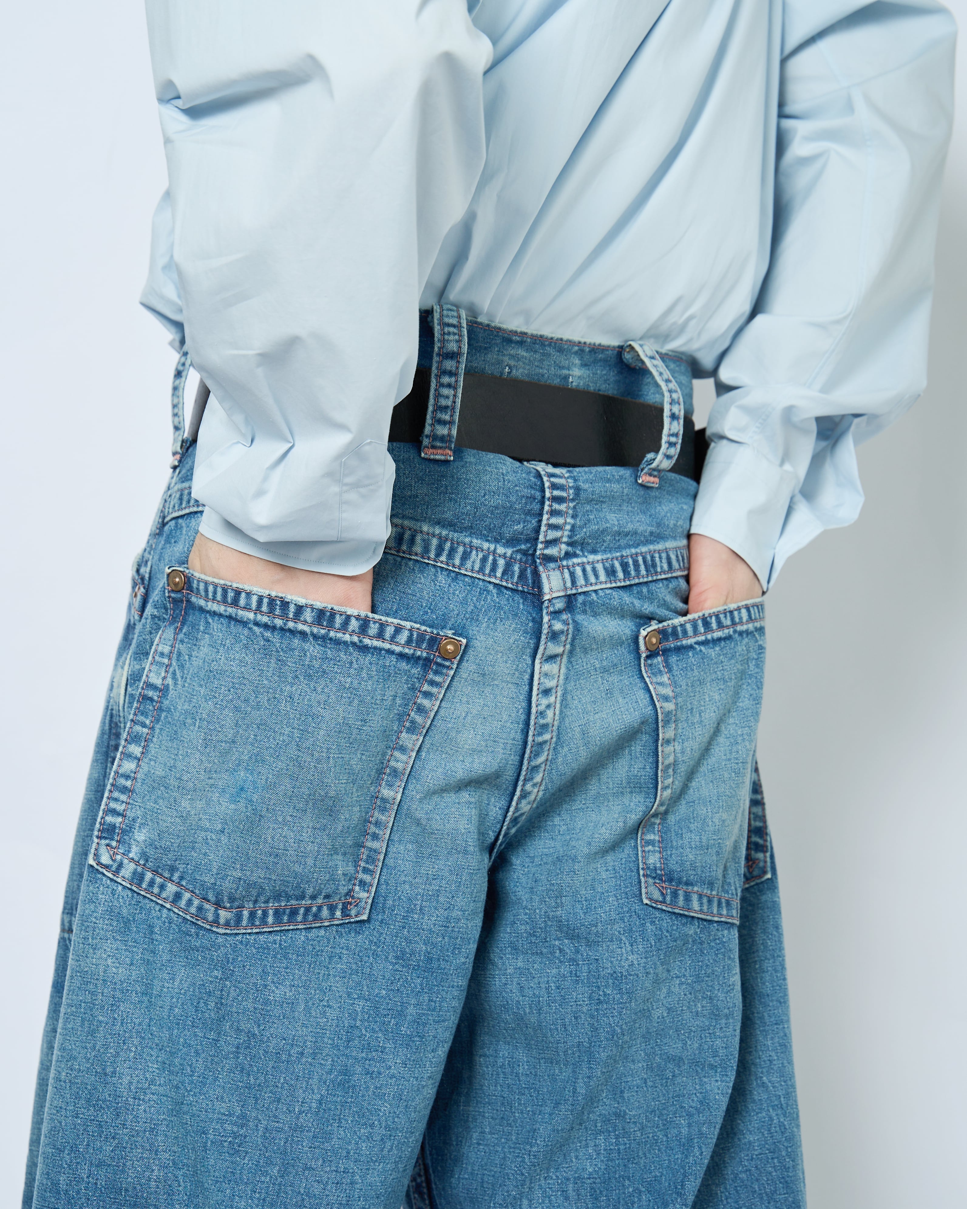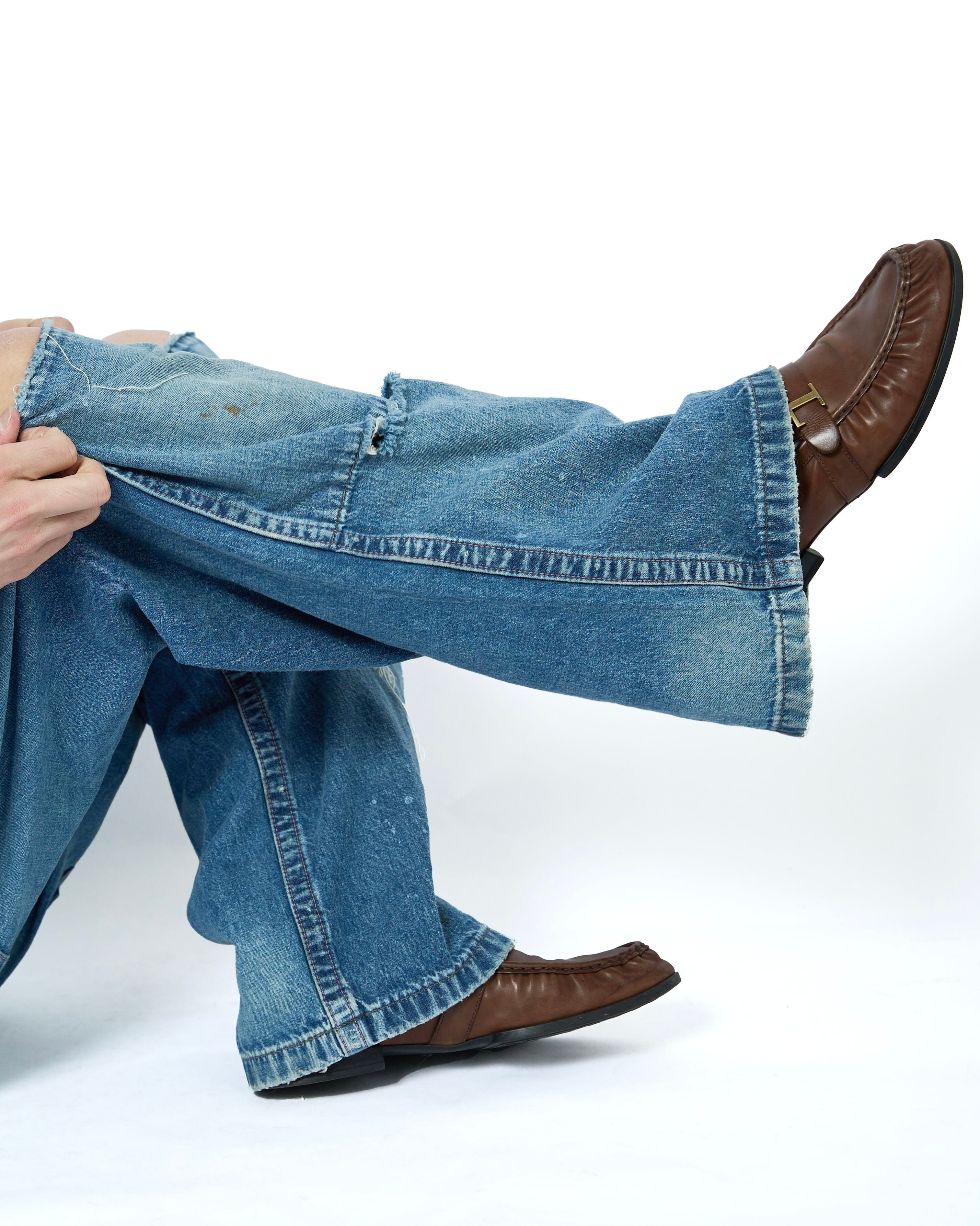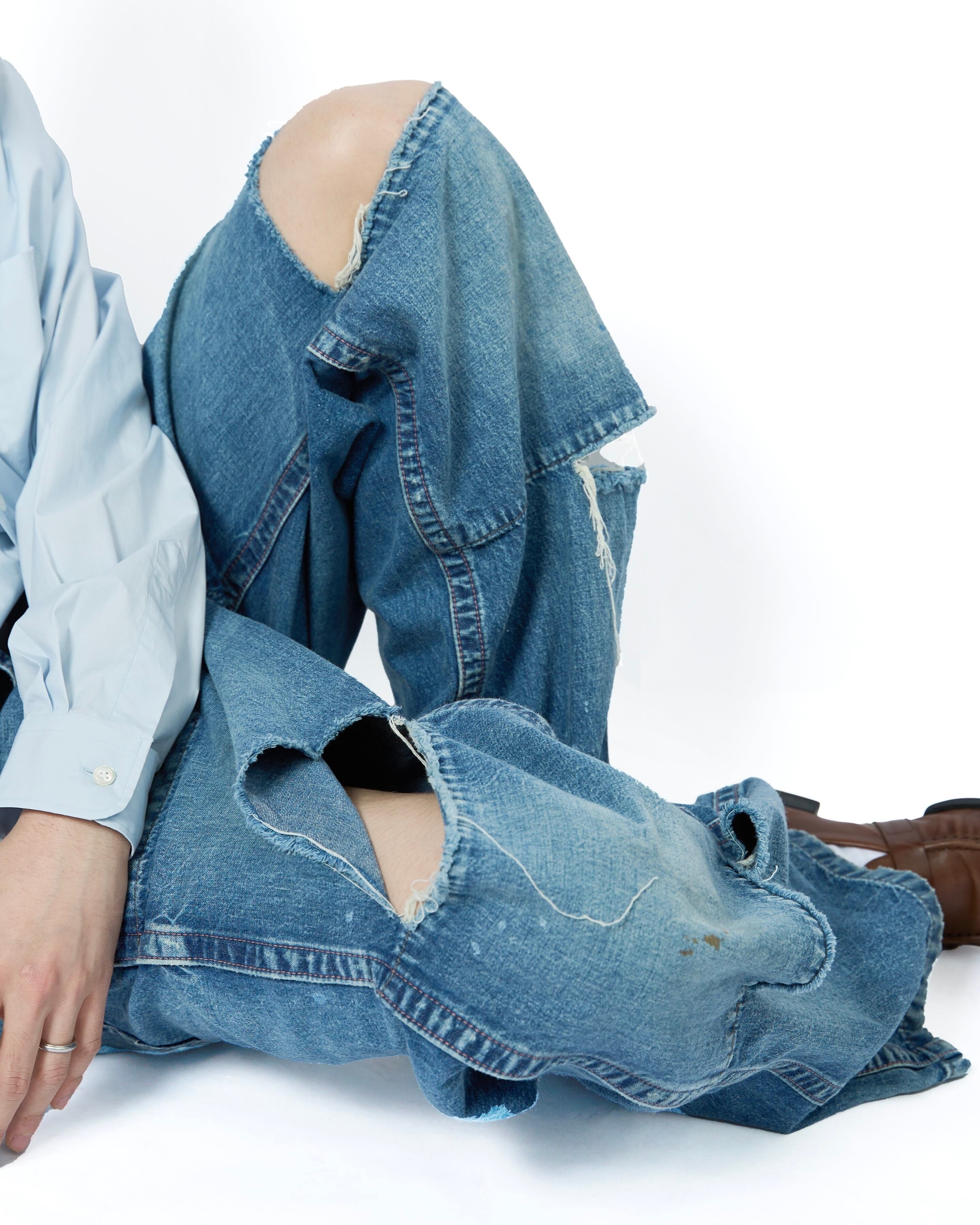 極端に太い足回りが特徴的で、堅牢な仕様であるダブルニー仕様。しかし、基のデザイン同様、に"酷使されながらも長年にわたって愛用されたサマ"を再現し、ダブルニー部分の両端が激しく破れているデザインになっています。