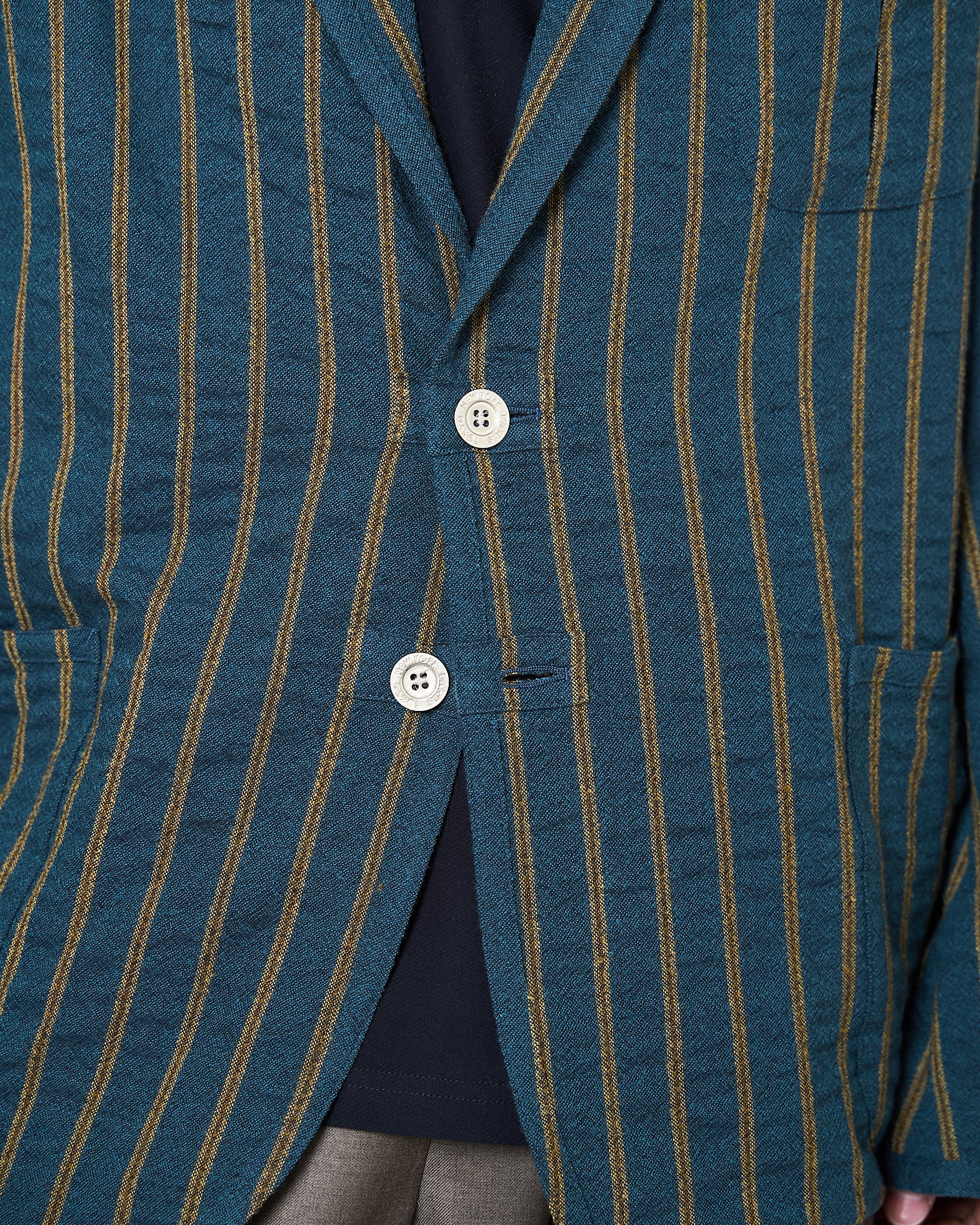 ヨーロピアンな配色のストライプに、デッドストックのボタンから来るヴィンテージのような佇まいに対して、カフスのない袖やカジュアルなポケットのディテールなど、ラフに着用できるm's らしい1着です。春先から、真夏にも。