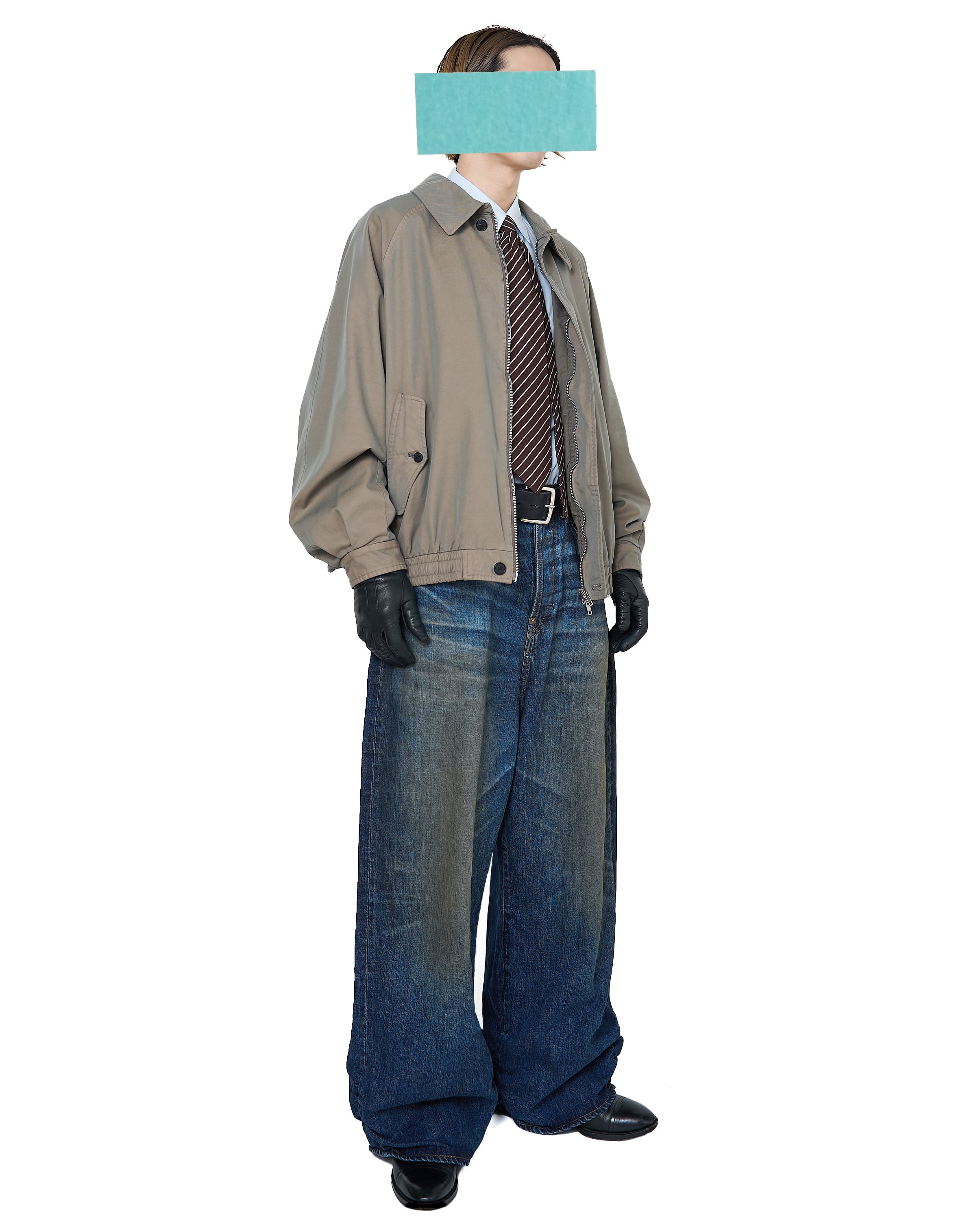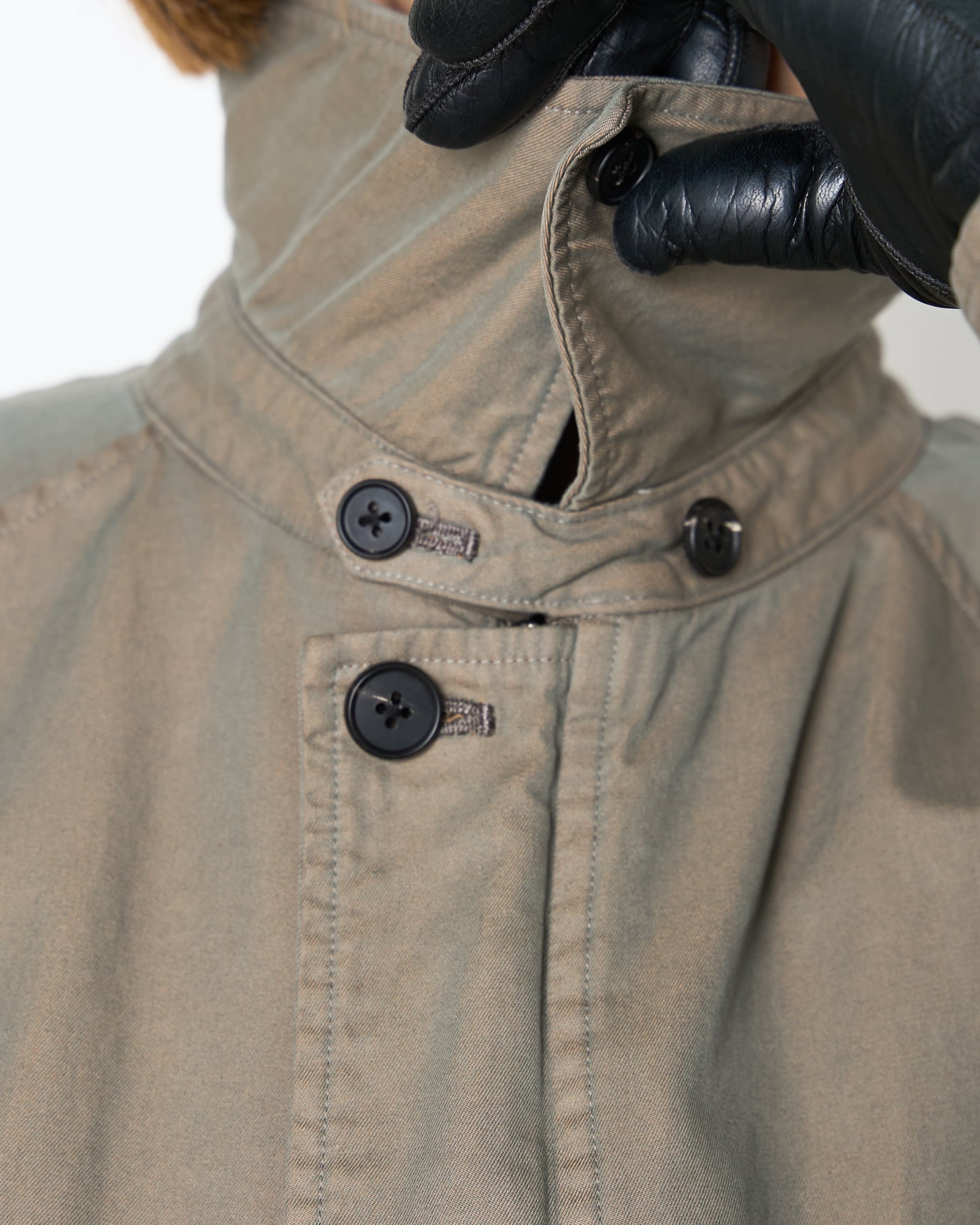 シンプルかつミニマルなデザインで、縦と横の糸が混ざり、角度によって色が変わる玉虫色に仕上がっています。vintageの風合いを出すためにバイオウォッシュをかけ、さらにオーバーダイで褪せた雰囲気を出した、Burberryやarmaniを思わせる1着。