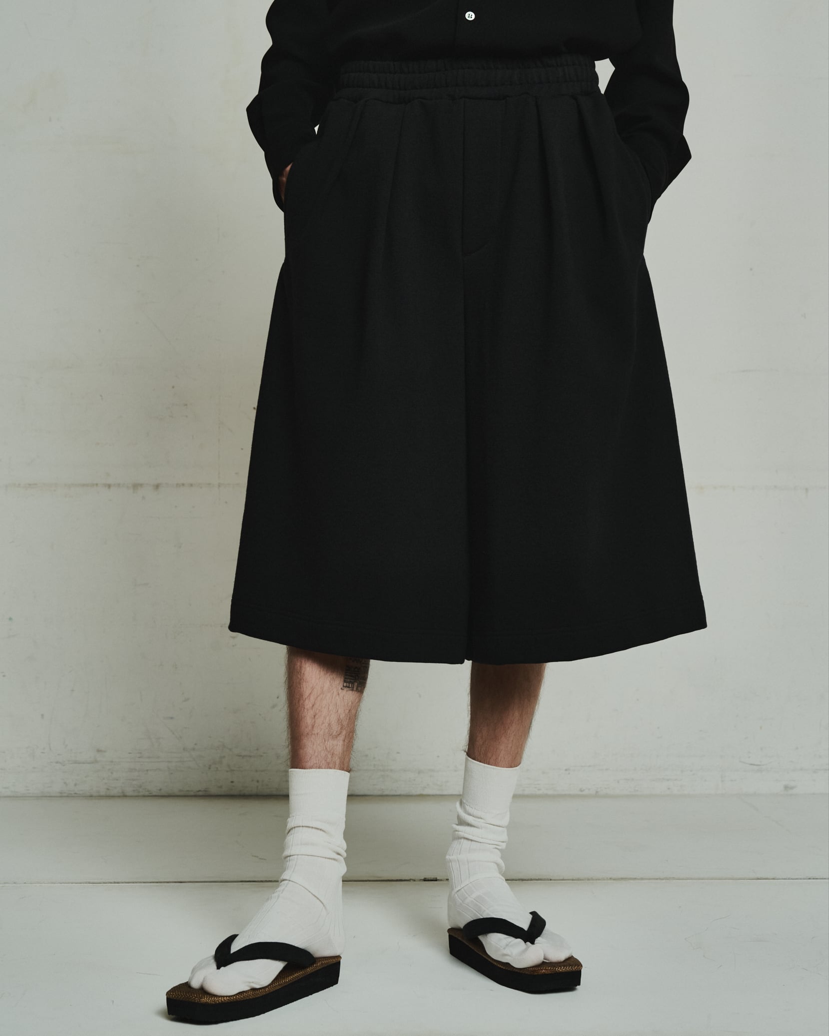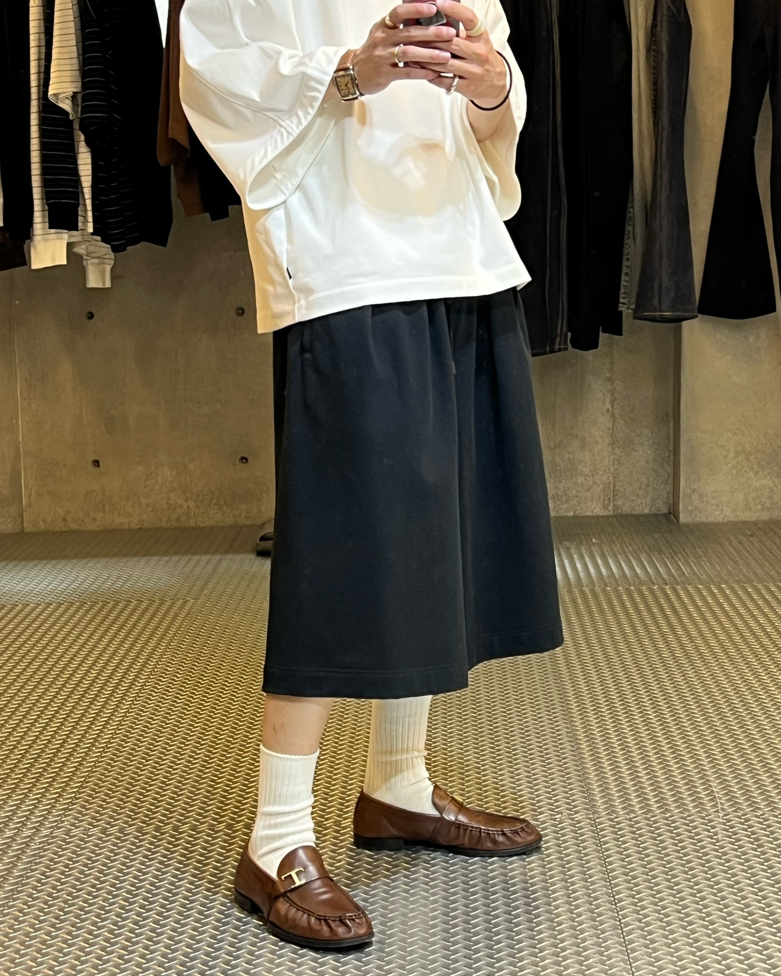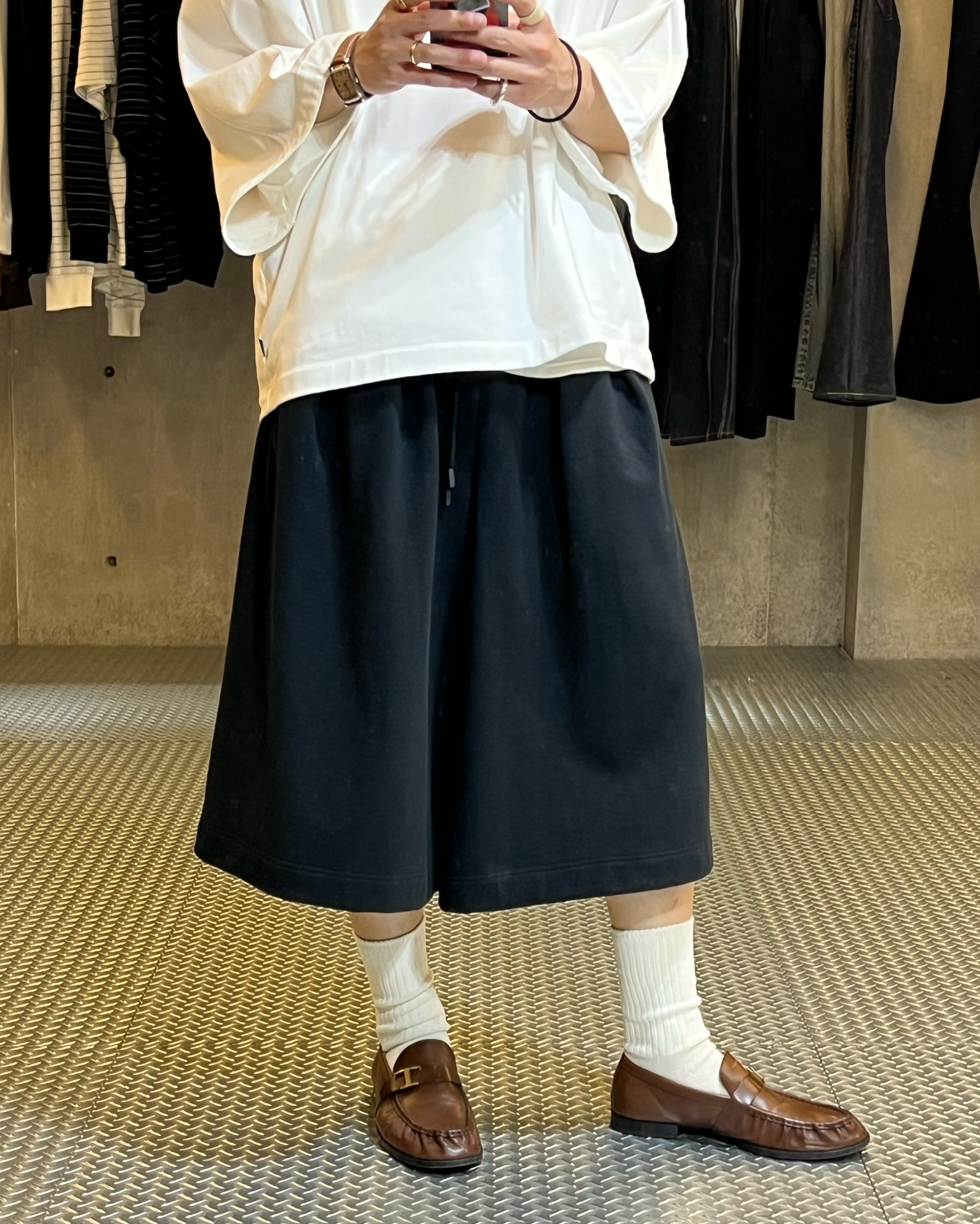 裾幅を広く設定したハカマのようなシルエットのスウェットショートパンツ。ハリのある薄手のオリジナル裏毛素材を使用し、脇線をなくすことで立体的なフォルムなっているのも特徴的。