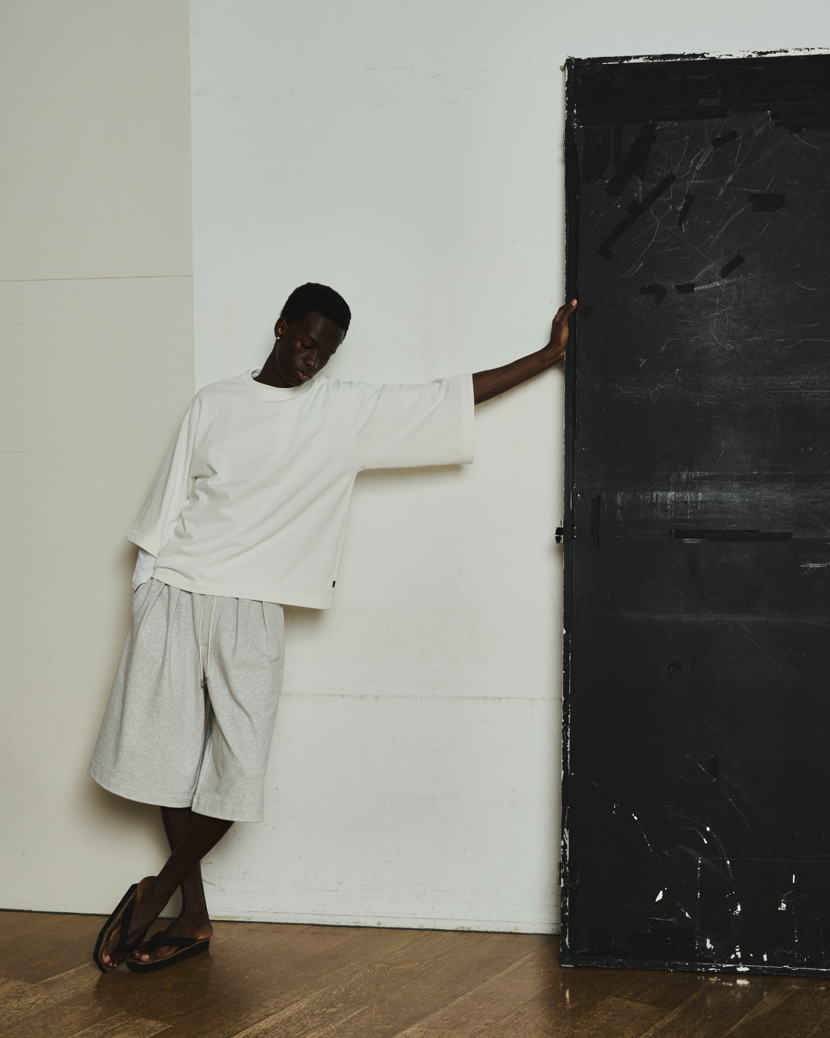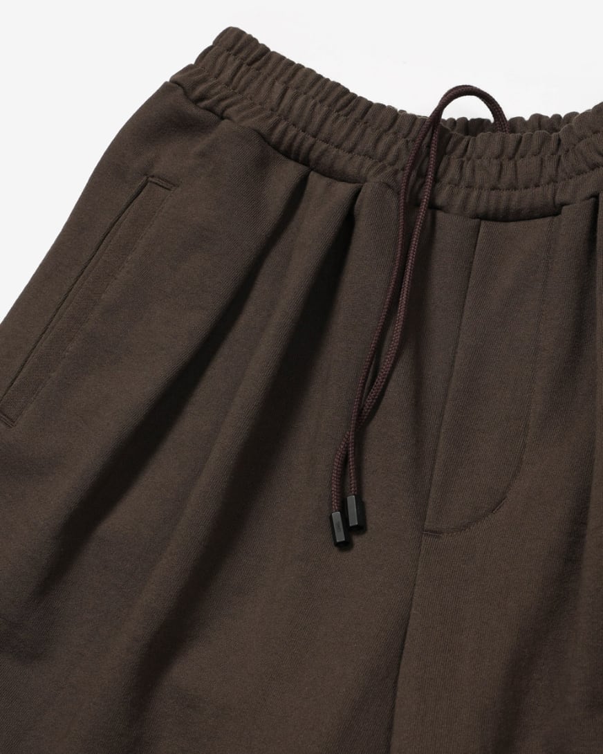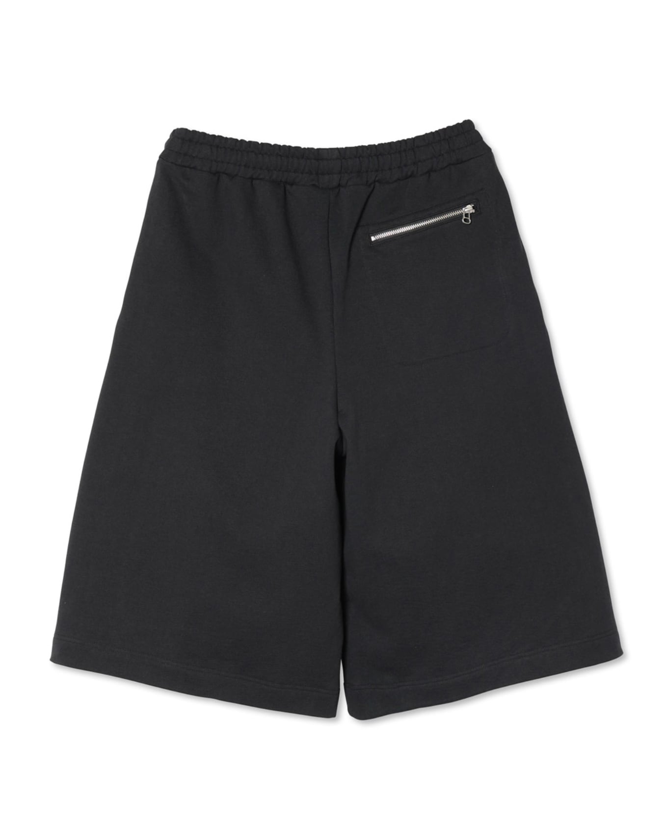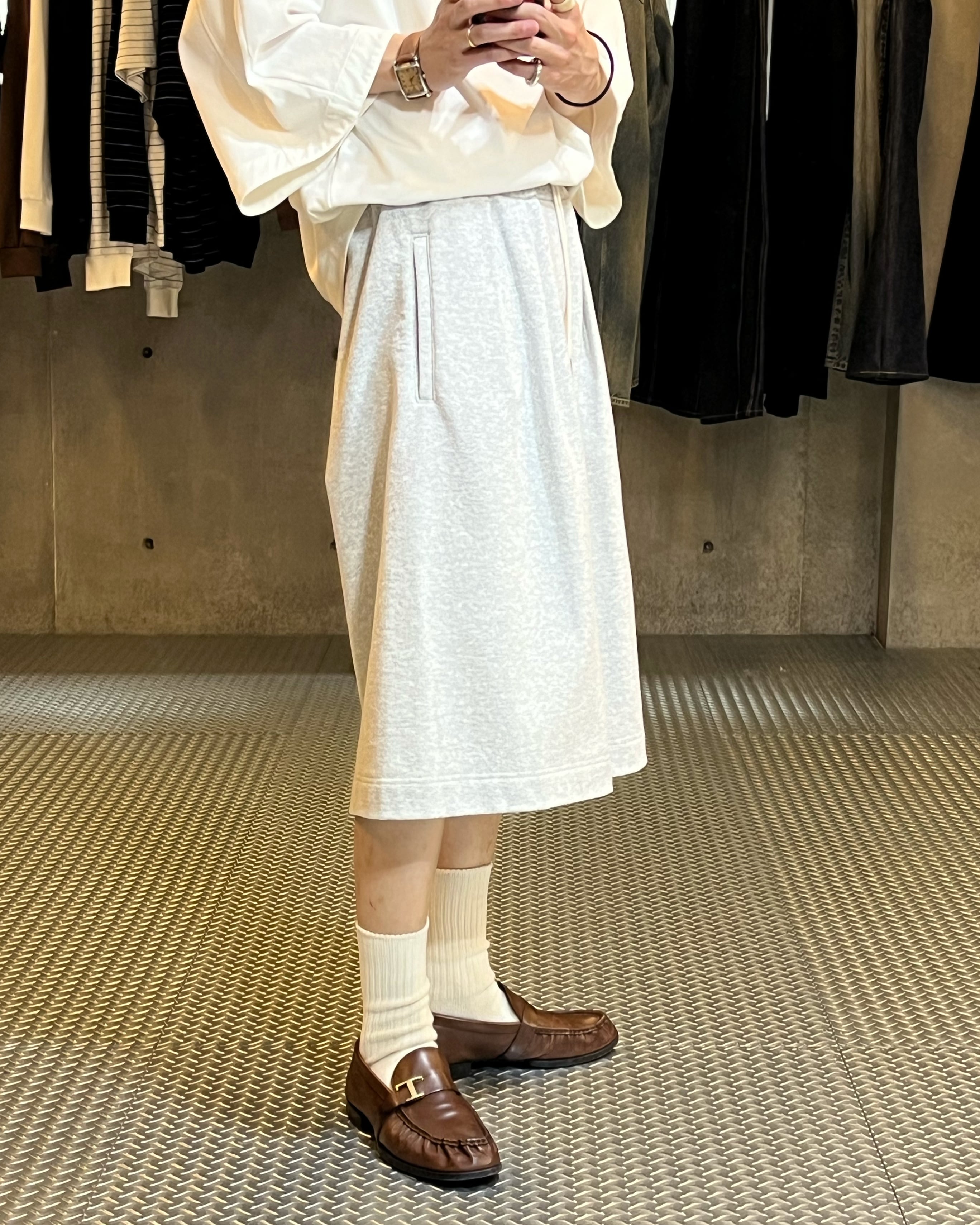 裾幅を広く設定したハカマのようなシルエットのスウェットショートパンツ。ハリのある薄手のオリジナル裏毛素材を使用し、脇線をなくすことで立体的なフォルムなっているのも特徴的。