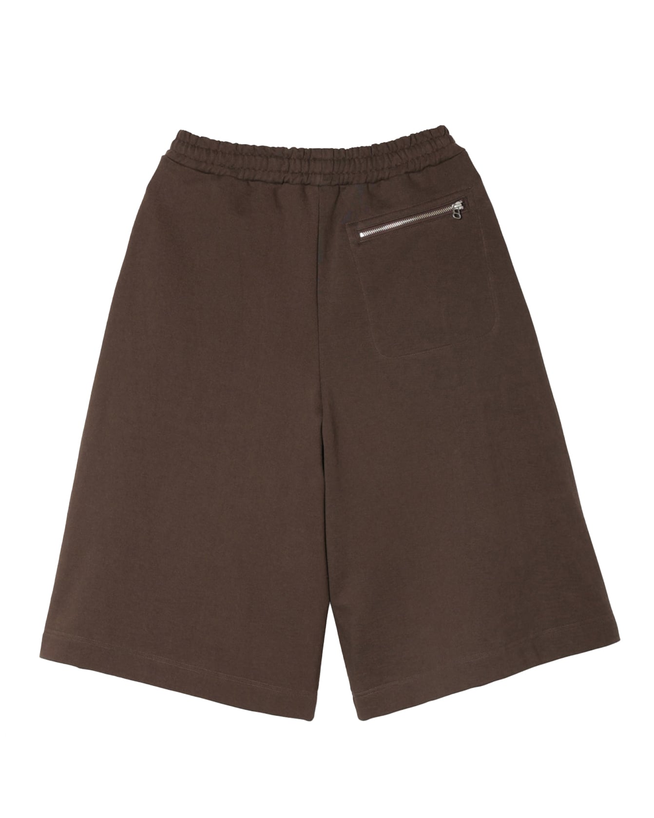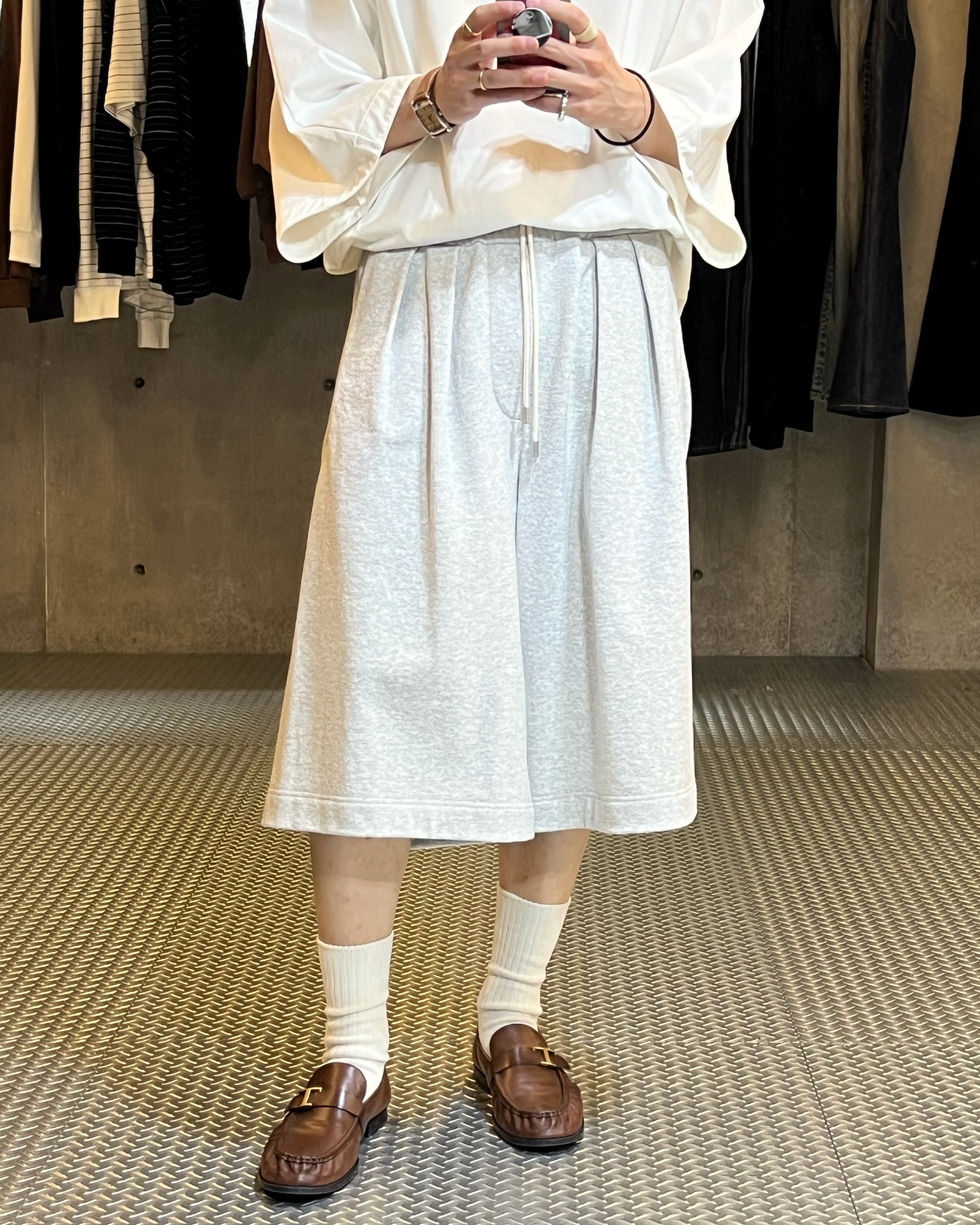 裾幅を広く設定したハカマのようなシルエットのスウェットショートパンツ。ハリのある薄手のオリジナル裏毛素材を使用し、脇線をなくすことで立体的なフォルムなっているのも特徴的。