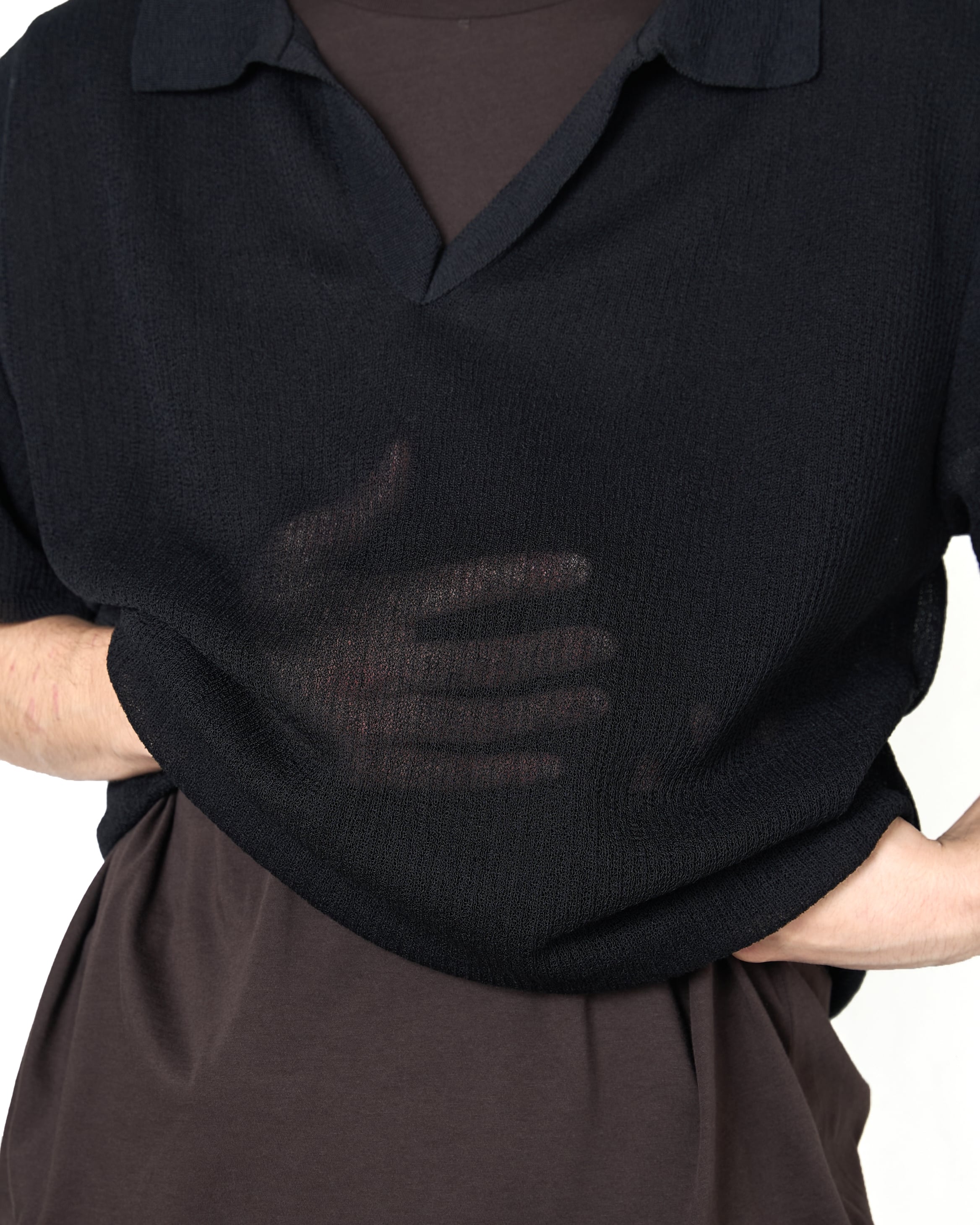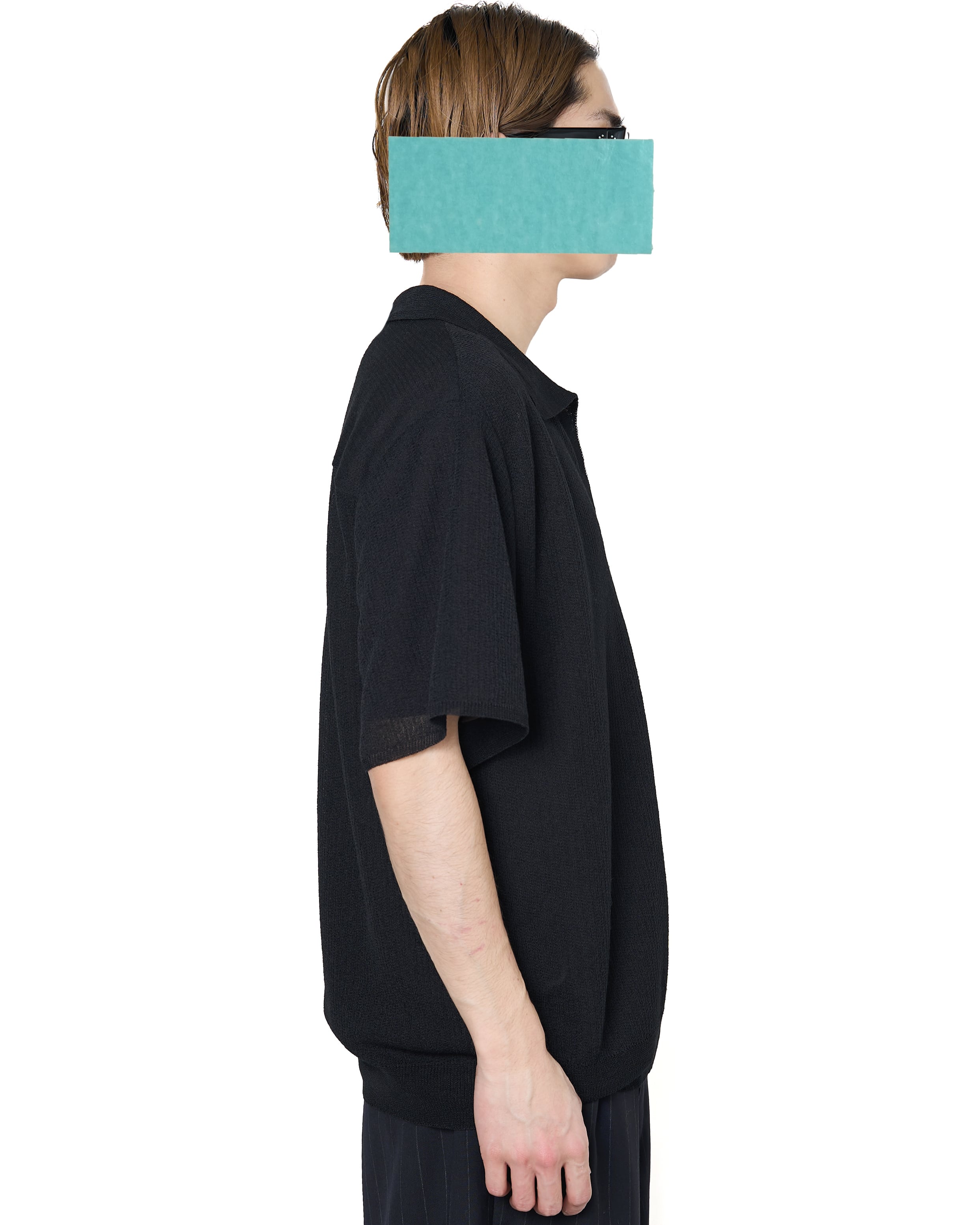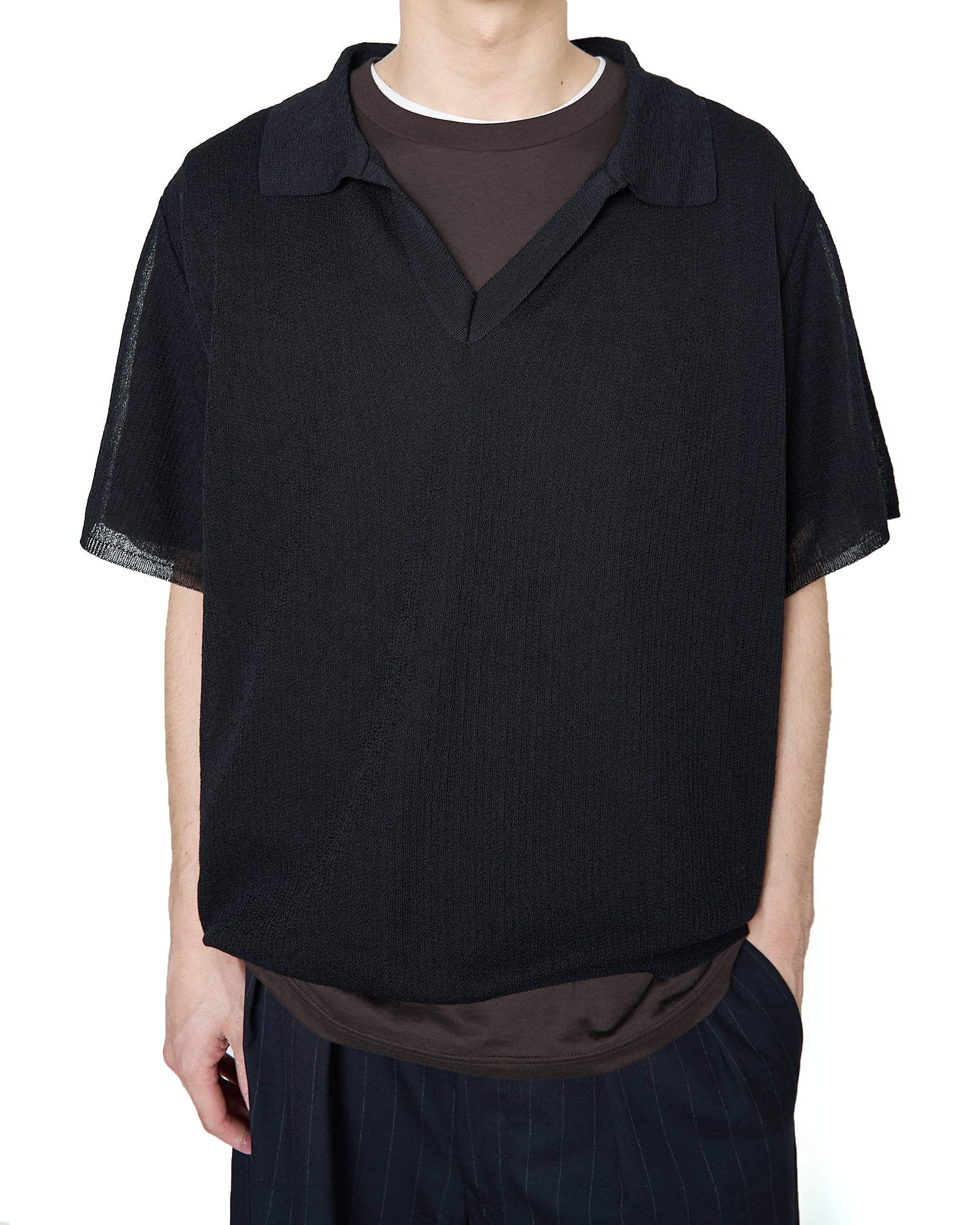 細番手の麻とポリエステルを組み合わせた透過性があり、ドライで清涼感のあるタッチが特徴の素材を使用したスキッパー半袖ニット。