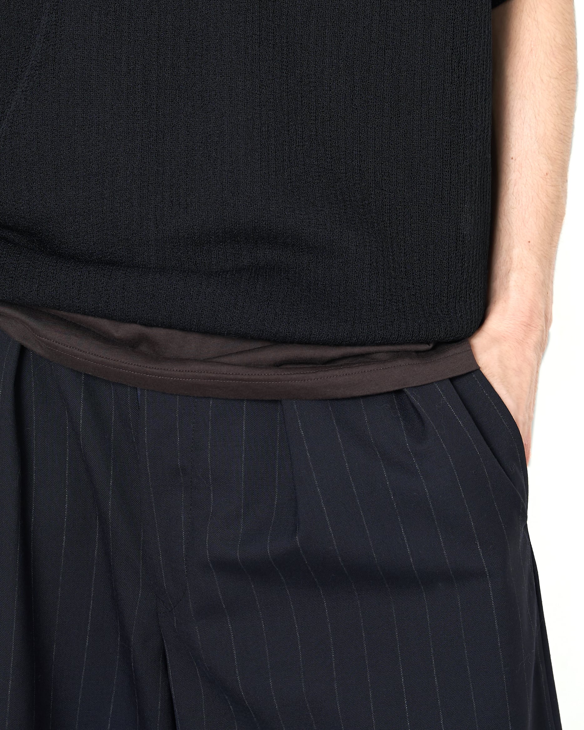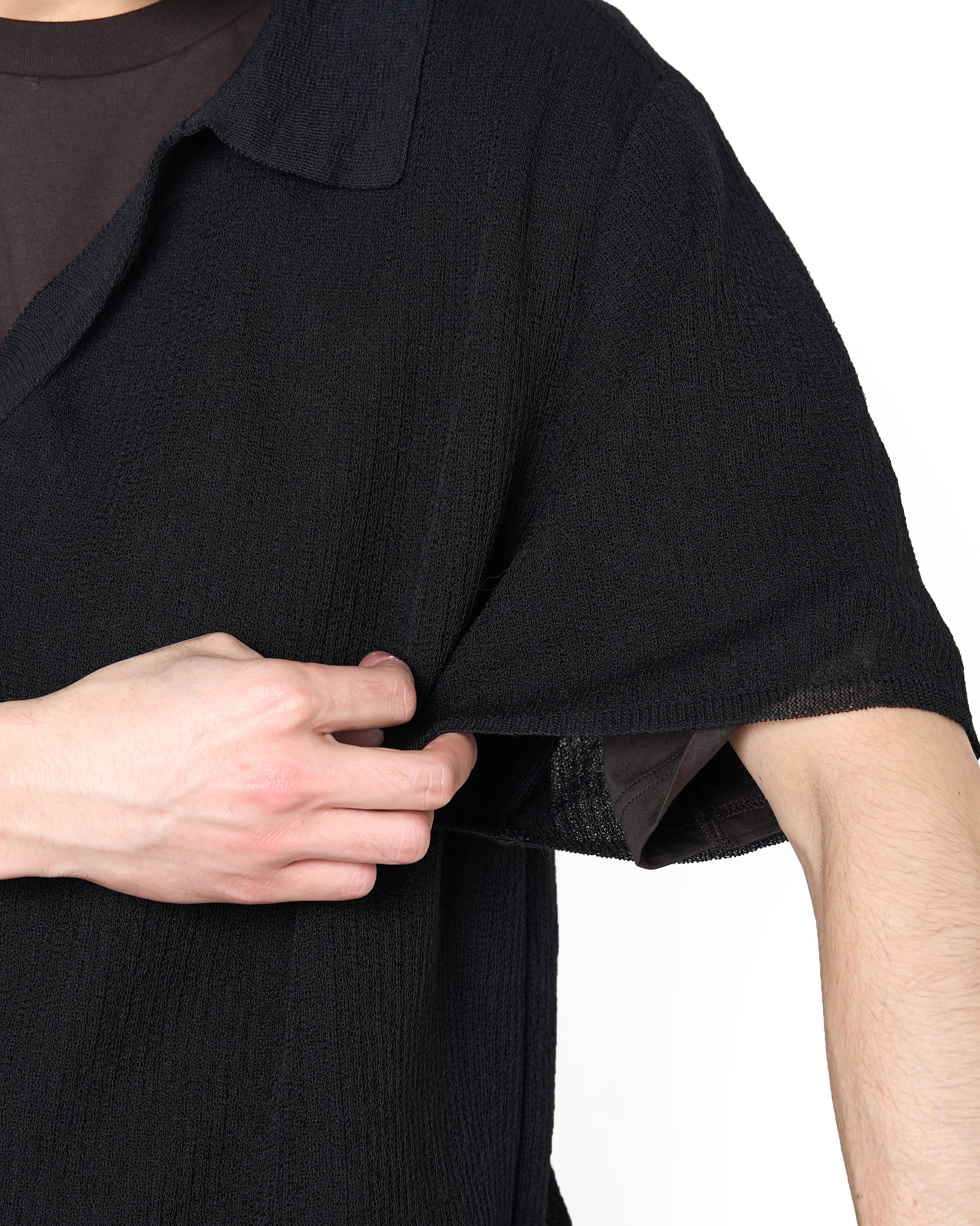 ジャカード編みを無地で編むことで表情が生まれ、極細の糸でも膨らみを感じられる編地に仕上げている。素材の性質に加え編みによる凹凸感が生まれ、肌に接する面が一定でないため、よりドライで清涼感のある1着に仕上げている。