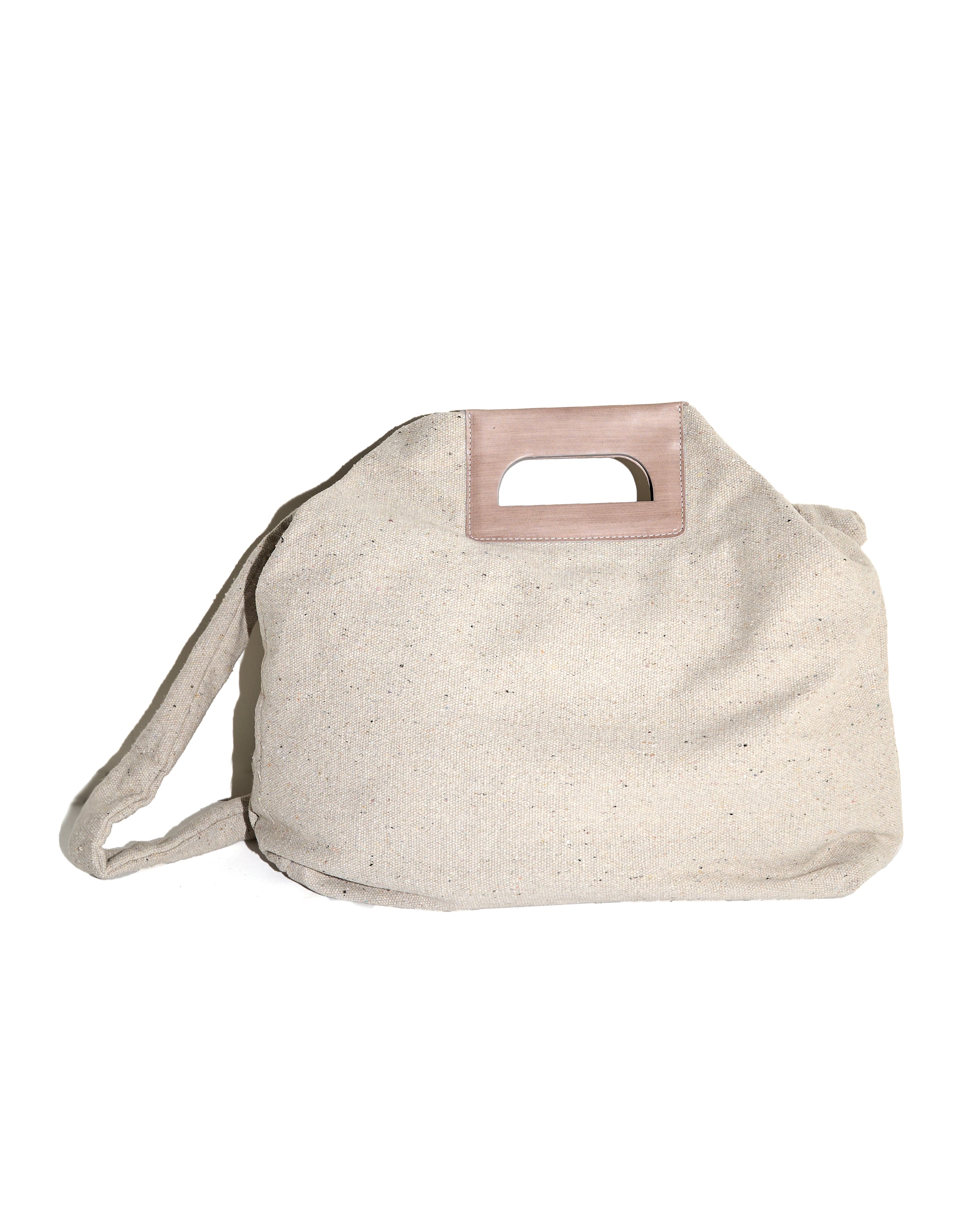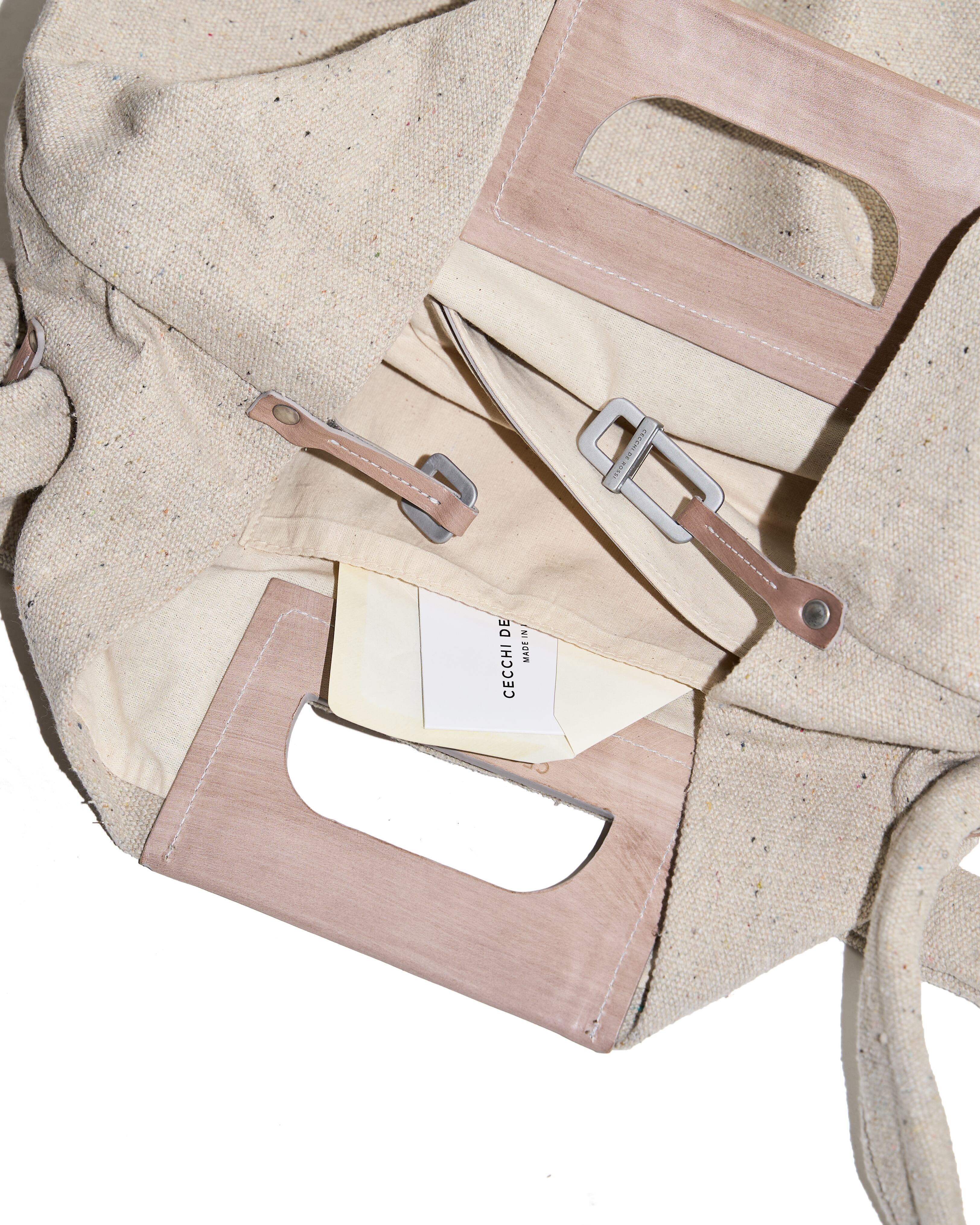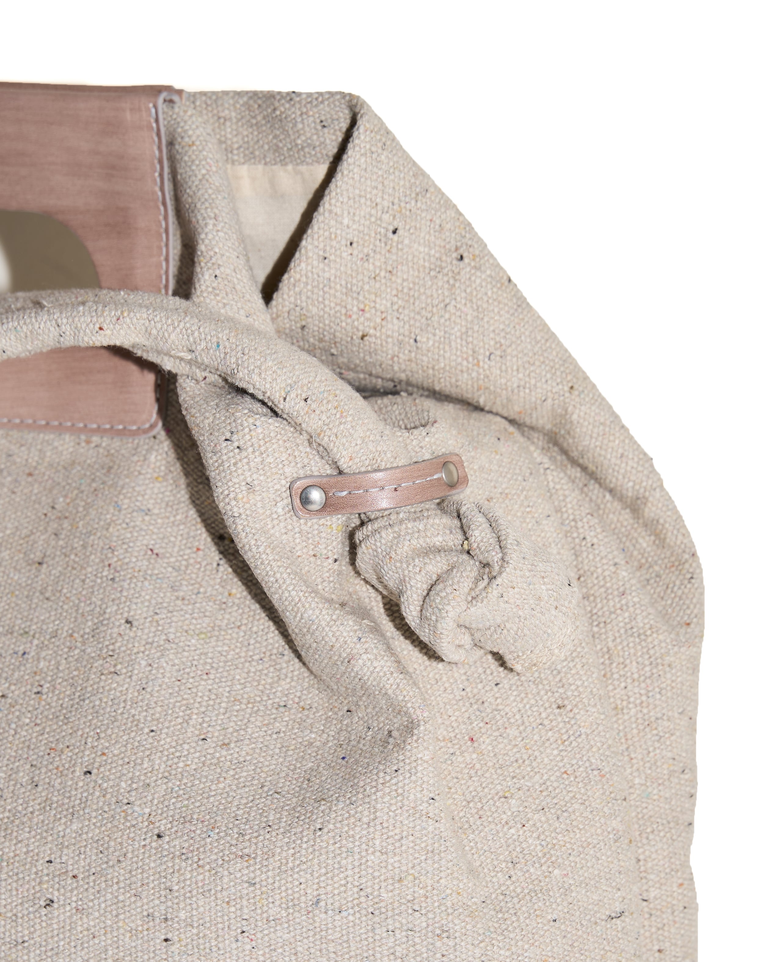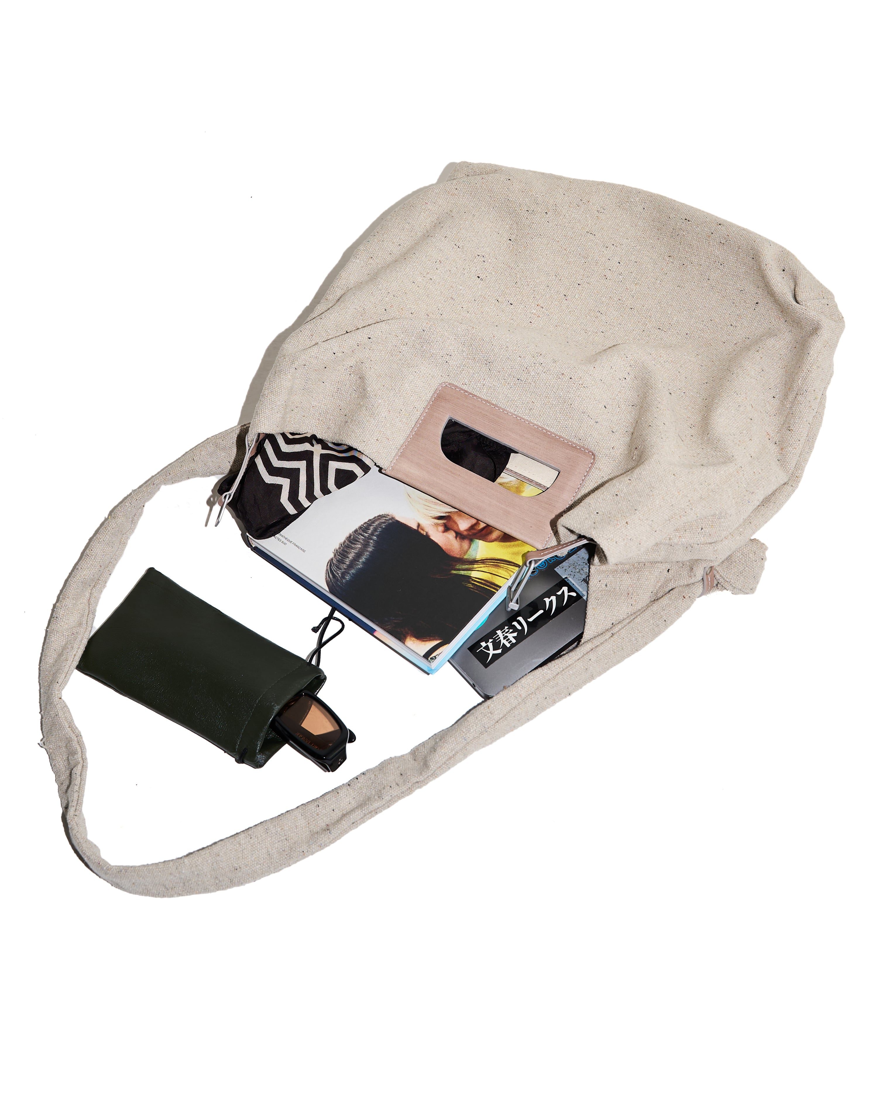 厚手なコットンキャンバスとホースレザーのギャップが美しいマーケットトート。リサイクルコットンを使用した粗野なボディとレザーの組み合わせのギャップが魅力的です。取り外し可能なショルダーストラップ、内側は3つに分かれており、真ん中にはファスナー付きの収納、サイドには小さなポケットが施されています。